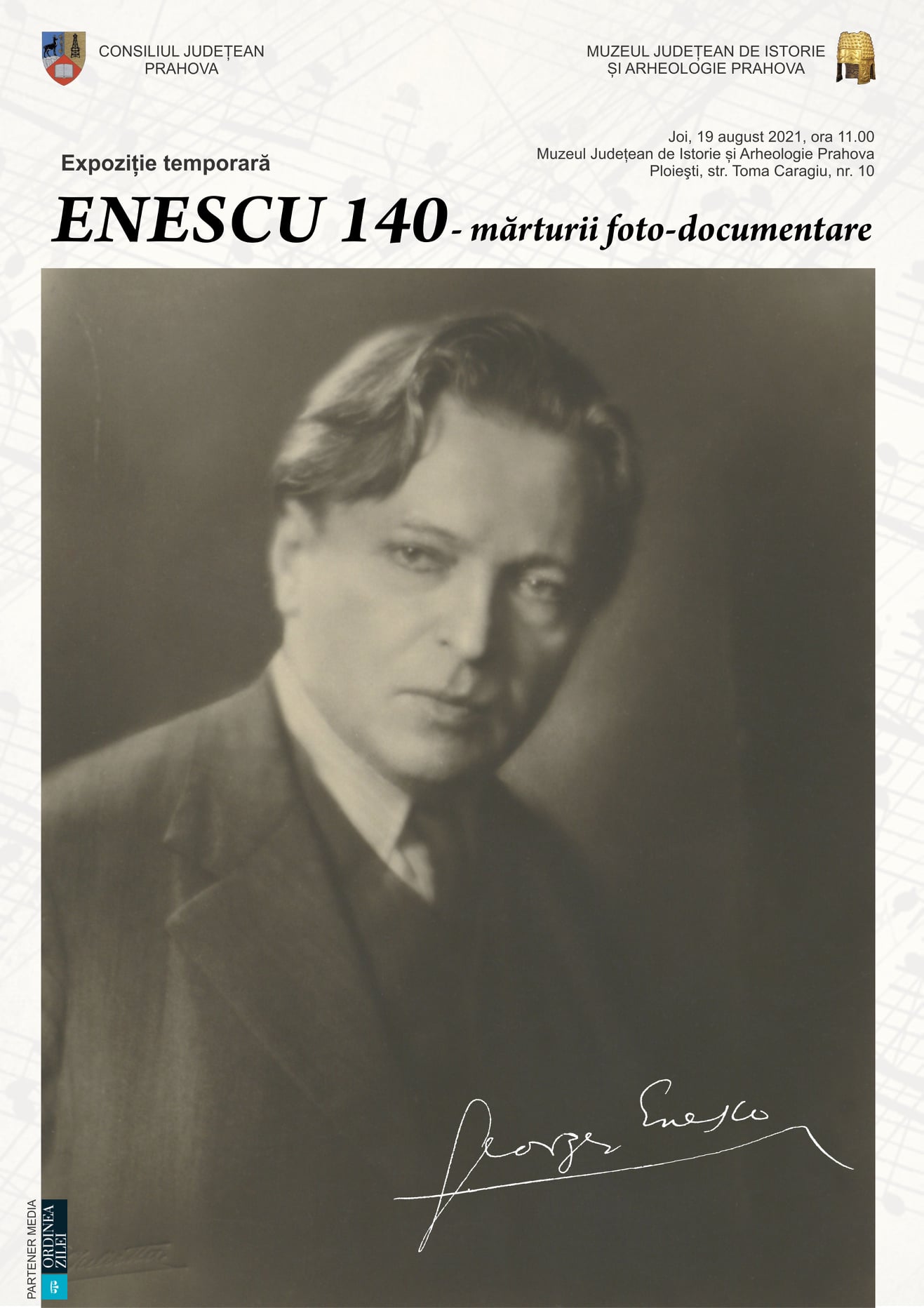 Muzeul Judeţean de Istorie şi Arheologie Prahova vă invită joi, 19 august 2021, ora 11.00, la sediul său din Ploieşti, str. Toma Caragiu, nr. 10, să participaţi la vernisajul expoziţiei temporare „ENESCU 140 – mărturii foto-documentare”.