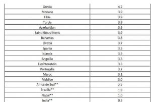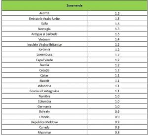 ZONA VERDE: Afganistan, Algeria, Angola, Antigua și Barbuda, Arabia Saudită, Australia, Austria, Bahrain, Bangladesh, Barbados, Benin, Bhutan, Bolivia, Bosnia și Herțegovina, Burkina Faso, Burundi, Cambodgia, Camerun, Canada, Capul Verde, Cehia, Chile, Ciad, Coasta de Fildeș, Columbia, Comore, Congo, Coreea de Sud, Croația, Djibouti, Ecuador, Egipt, El Salvador , Emiratele Arabe Unite, Eritreea, Etiopia, Gabon, Gambia, Germania, Ghana, Grenada, Guineea, Guineea Bissau, Guineea Ecuatorială, Haiti, Indonezia, Insulele Cayman, Insulele Falkland (Malvine), Insulele Feroe, Insulele Mariane de Nord, Insulele Marshall, Insulele Solomon, Insulele Virgine Britanice, Iordania, Italia, Kârgâzstan, Kenya, Kuweit , Laos, Lesotho, Letonia, Liberia, Luxemburg, Madagascar, Malawi, Mali, Mauritania, Micronezia, Montserrat, Mozambic, Myanmar, Namibia, Nicaragua, Niger, Nigeria, Norvegia, Noua Caledonie, Noua Zeelandă, Oman, Pakistan, Papua Noua Guinee, Paraguay, Peru, Polonia, Qatar, Republica Centrafricană, Republica Democrată Congo, Republica Dominicană, Republica Moldova, Republica Populară Chineză, România, Rwanda, Sahara de Vest,Saint Vincent și Grenadine, Sao Tome și Principe, Senegal, Sierra Leone, Singapore, Siria, Slovacia, Somalia, Sudan, Sudanul de Sud, Suedia, Tadjikistan, Taiwan, Tanzania, Togo, Ucraina, Uganda, Ungaria, Uruguay, Uzbekistan, Vanuatu, Vatican, Venezuela, Vietnam, Wallis și Futuna, Yemen, Zambia, Zimbabwe.