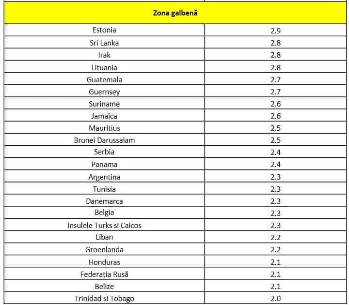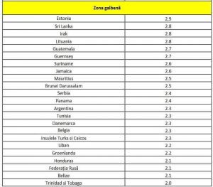 ZONĂ GALBENĂ: Albania, Andorra, Argentina, Armenia, Belarus, Belgia, Belize, Bermuda, Bonaire, Saint Eustatius și Saba, Brunei Darussalam, Bulgaria, Danemarca, Estonia, Federația Rusă, Filipine, Finlanda, Groenlanda, Guatemala, Guernsey, Guyana, Honduras, Insulele Turks și Caicos, Irak, Jamaica, Japonia, Liban, Lituania, Malta, Mauritius, Mexic, Olanda, Palestina, Panama, San Marino, Serbia, Slovenia, Sri Lanka, Suriname, Timorul de Est, Trinidad și Tobago, Tunisia.