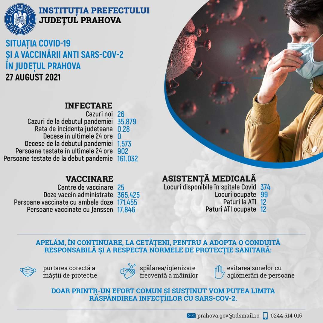 Instituția Prefectului Județului Prahova informează că astăzi, conform datelor centralizate de Direcția de Sănătate Publică, situația epidemiologică privind COVID-19 în județul Prahova, se prezinta astfel