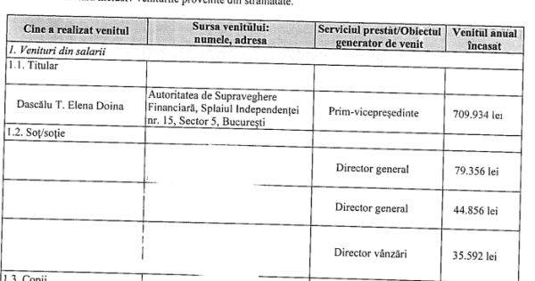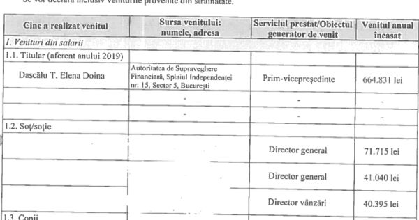 Aşa aflăm că Doina Dascălu a încasat în anul 2020, net, de la ASF suma de 709.934 lei (peste 145.000 de euro, peste 12.000 de euro lunar). L-a făcut de ruşine pe soţul Romulus Dascălu, apropiatul fraţilor Micula, care, deşi era director general la două companii şi director de vânzări la o a treia, nu a reuşit din cele trei locuri de muncă să adune decât 159.804 lei, respectiv doar 22,5% din venitul dintr-o singură sursă a doamnei Dascălu.