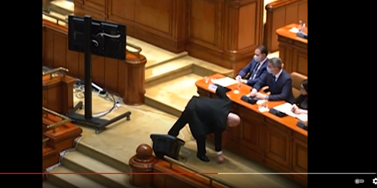 Au trecut 33 de secunde, până ce a fost chemat un „sclav”, angajat al Camerei Deputaților, care s-a aplecat și i-a ridicat, în timp ce el, privea absent, într-un punct neprecizat, cu o privire bovină. Mai departe: sute de persoane, între care care zeci de copii, au plecat, cu trenul din Mangalia și au ajuns la destinație, în Drobeta Turnu Severin, după două zile. A fost blocat pe câmp, iar mai apoi, din nou, într-o pădure, din cauza defecțiunilor succesive.