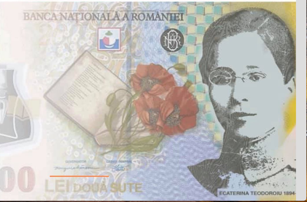 In toamna asta Romania va avea prima bancnota pe care apare chipul unei femei – Ecaterina Teodoroiu. Foarte bine! Mare pacat ca bacnota va fi semnata de un turnator la Securitate, Mugur Isarescu, ale carui preocupari originare erau sa toarne la Securitate femei ,,divortate”, ,,nemultumite”, ,,singure în casă” care ,,se etalau exagerat la servici”, care ,,deranjau colegii” și mai erau și nemultumite de ,,transportul din Drumul Taberei, de încălzirea locuinței, de aprovizionare cu alimente” și care mai și făceau ,,comparații cu situația din alte țări socialiste”, precizeaza analistul Radu Teodor Soviani. (Cerasela N.).