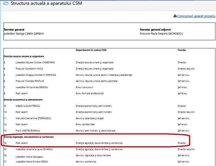 Surprize, surprize! Judecatoarea Andreea Uzalu – cunoscuta si sub denumirea de “regina detasarilor”, dupa ce din 2008 si pana in prezent a fost doar noua zile judecator de scaun, in rest stand pe detasari succesive in CSM – a fost inlocuita de la conducerea Directiei legislatie, documentare si contencios (DLDC) din Consiliul Superior al Magistraturii, functie in care fusese instalata de actualul sef al CSM “Jelly” Bogdan Mateescu (click aici pentru a citi). Ca Uzlau nu mai e directoarea Directiei legislatie, documentare si contencios (DLDC) am aflat de pe site-ul CSM, unde a fost publicata structura aparatului de lucru al Consiliului, unde in dreptul acestei functii figureaza mentiunea post vacant (vezi facsimil). Inlaturarea Andreei Uzlau de la sefia DLDC este insa neasteptata, avand in vedere ca aceasta se numara printre favoritii membrilor CSM, inclusiv a lui Mateescu. Dovada sunt tocmai detasarile nesfarsite dispuse in CSM, Uzlau fiind judecator de scaun doar 9 zile in ultimii 13 ani. Tocmai surpriza produsa de inlaturarea Andreei Uzlau ne face sa ne intrebam daca nu cumva aceasta a fost executata de Bogdan Mateescu pentru ca nu a raspuns la niste comenzi. Cine stie ce nu a vrut sa faca Uzlau? Rau e la nervi puiutul fostului colaborator al Securitatii Mihai Mateescu… Sa nu se supere cumva John Uzlau, sotul Andreei, ca nu il vedem bine deloc pe „Slugarete”.