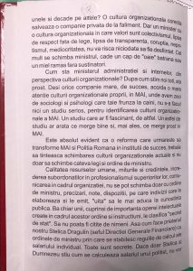Însă când vorbim despre evoluție a unui sistem, in cazul nostru, al Ministerul Afacerilor Interne, nu consider că trebuie să ne raportăm la performanțele tehnologice firești care sunt asimilate si de Poliție pentru a ține pasul cu realitățile socio-economice, ci la salarizarea polițiștilor, la drepturile lor bănești, cultura organizațională, modul în care se recompensează performanța și lucrătorii merituoși.