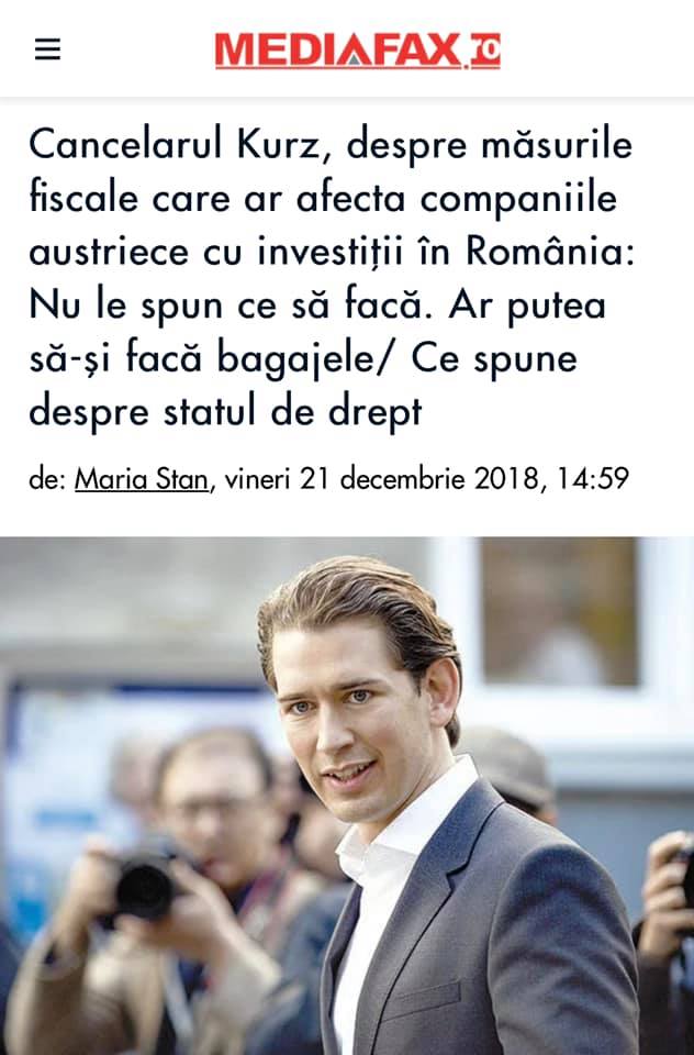 Acum 2 ani Kurz ne certa, in vizita fiind, de fata cu Iohannis si ameninta cu retragerea firmelor austriece din Romania! Impertinentei diplomatice la care, evident ca Romania si Iohannis, n-au raspuns!Ba chiar ne si tinea lectii despre Statul de Drept! Acum demisioneaza, coplesit de reactii generate de presupuse fapte de coruptie, conchide jurnalistul Ionut Cristcahe! (Paul D.).