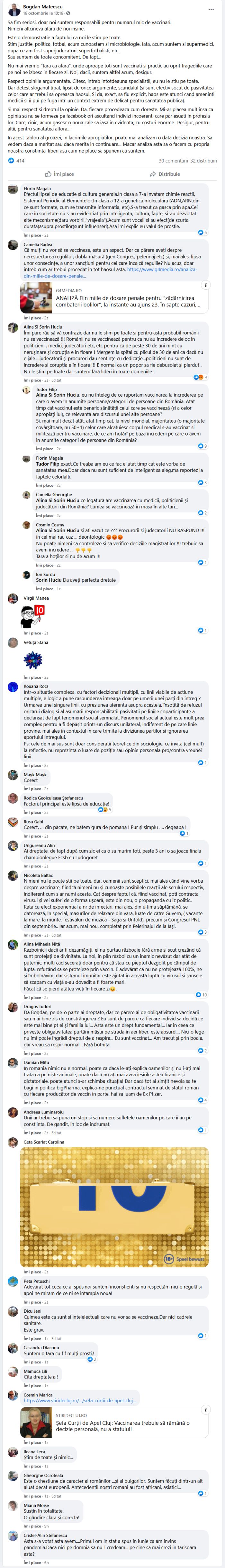 „Da Bogdan, pe de-o parte ai dreptate, dar ce parere ai de obligativitatea vaccinarii sau mai bine zis de constrangerea? Eu sunt de parere ca fiecare individ sa decida ce este mai bine pt el si familia lui… Asta este un drept fundamental… Iar in ceea ce priveste obligativitatea purtarii mastii pe strada in aer liber, este absurd…. Nici o lege nu imi poate ingradi dreptul de a respira… Eu sunt vaccinat… Am trecut si prin boala, dar vreau sa respir normal… Fara botnita”.