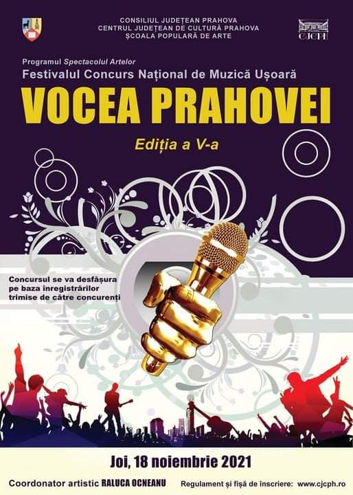 Centrul Județean de Cultură Prahova și Consiliul Județean Prahova organizează joi, 18 noiembrie 2021, FESTIVALUL-CONCURS NAȚIONAL DE MUZICĂ UȘOARĂ PENTRU COPII ȘI TINERI „VOCEA PRAHOVEI”, EDIȚIA a V-a.
