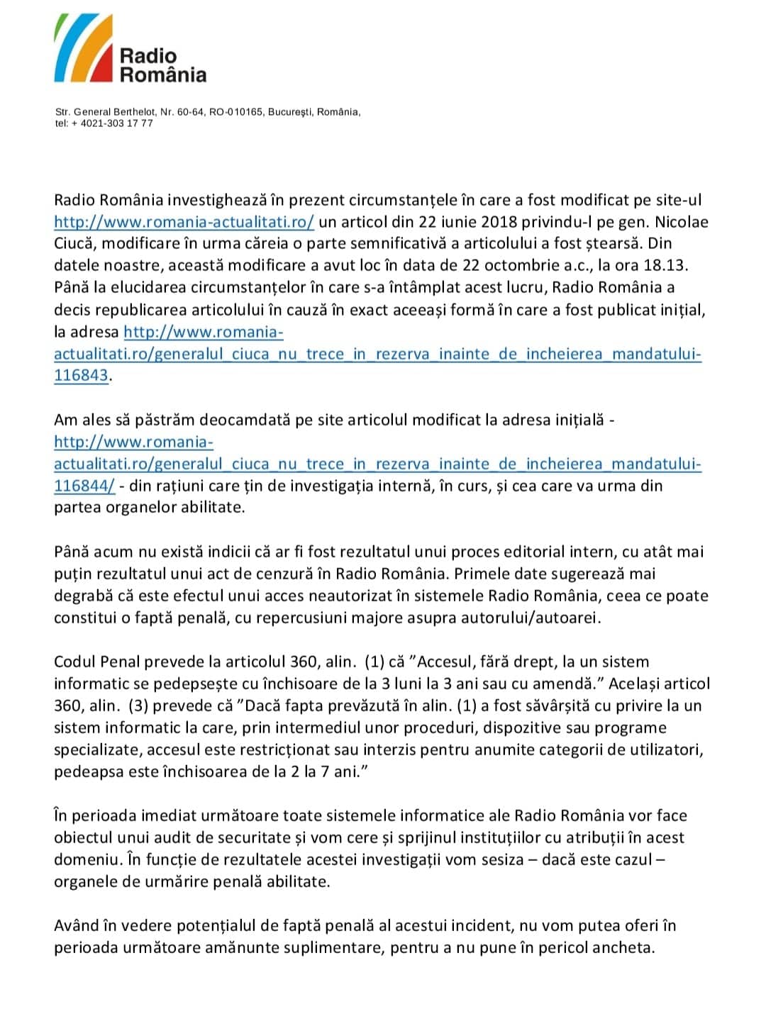 Un articol de pe site-ul Radio România Actualități a fost republicat, după ce postul public de radio a constatat că modificarea a fost făcută în urma unui acces neautorizat la rețeaua informatică.