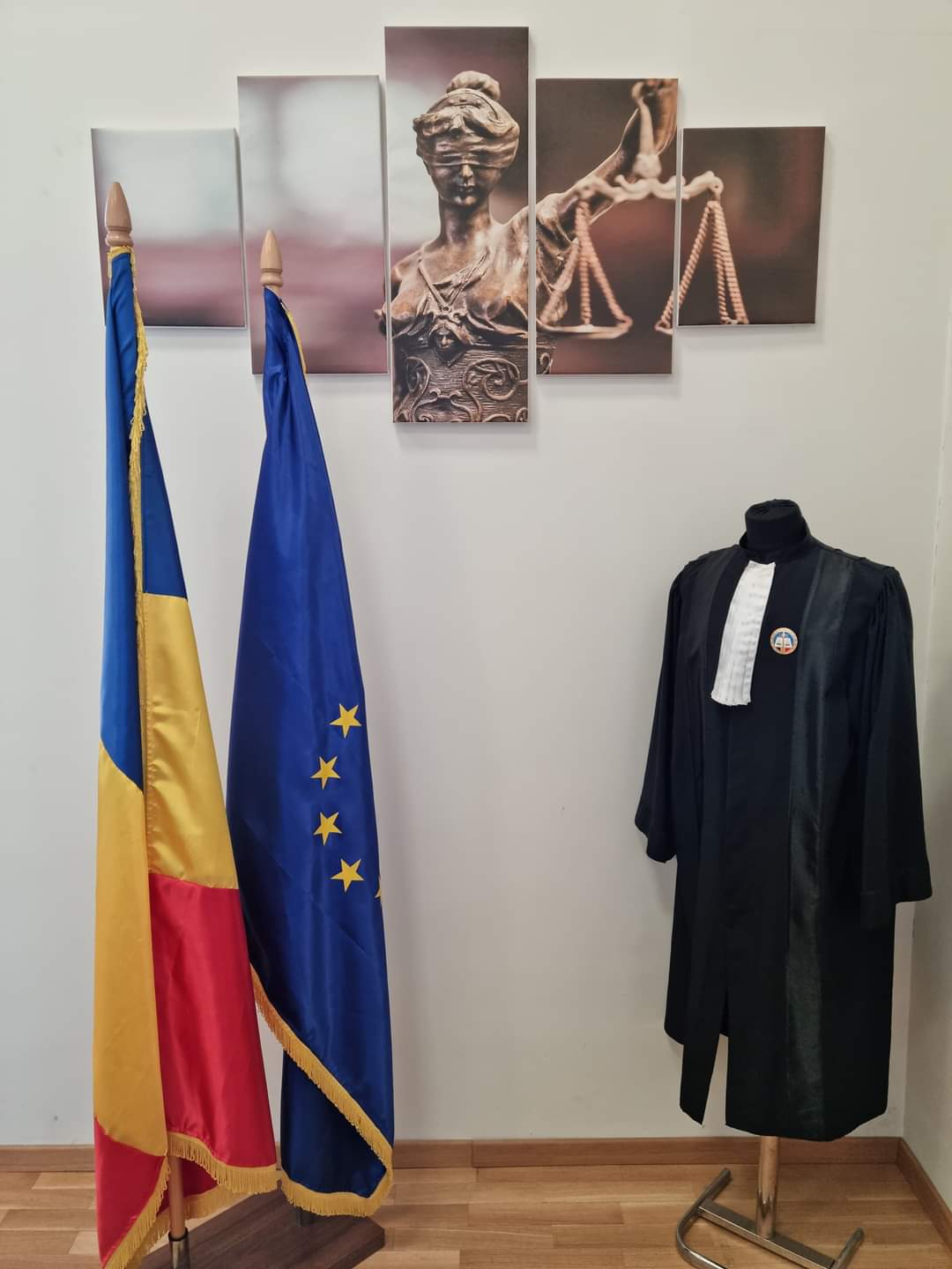 Realitatea cotidiană ne restrânge și în acest an posibilitățile de celebrare, astfel că ne rezumăm la marcarea „virtuală” a celor doua evenimente, cu această fotografie ce cuprinde reunite mai multe simboluri specifice justiției: Zeița justiției, Themis, legată la ochi și ținând în mână balanța, roba, insigna de judecător și cele două drapele, al României și al Uniunii Europene.