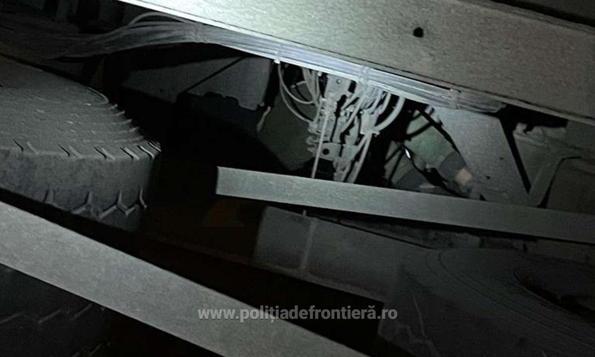 În urma controlului preliminar efectuat asupra mijlocului de transport, polițiștii de frontieră au depistat ascunsă, pe osia semiremorcii, o persoană de sex masculin fără documente de identitate asupra sa.