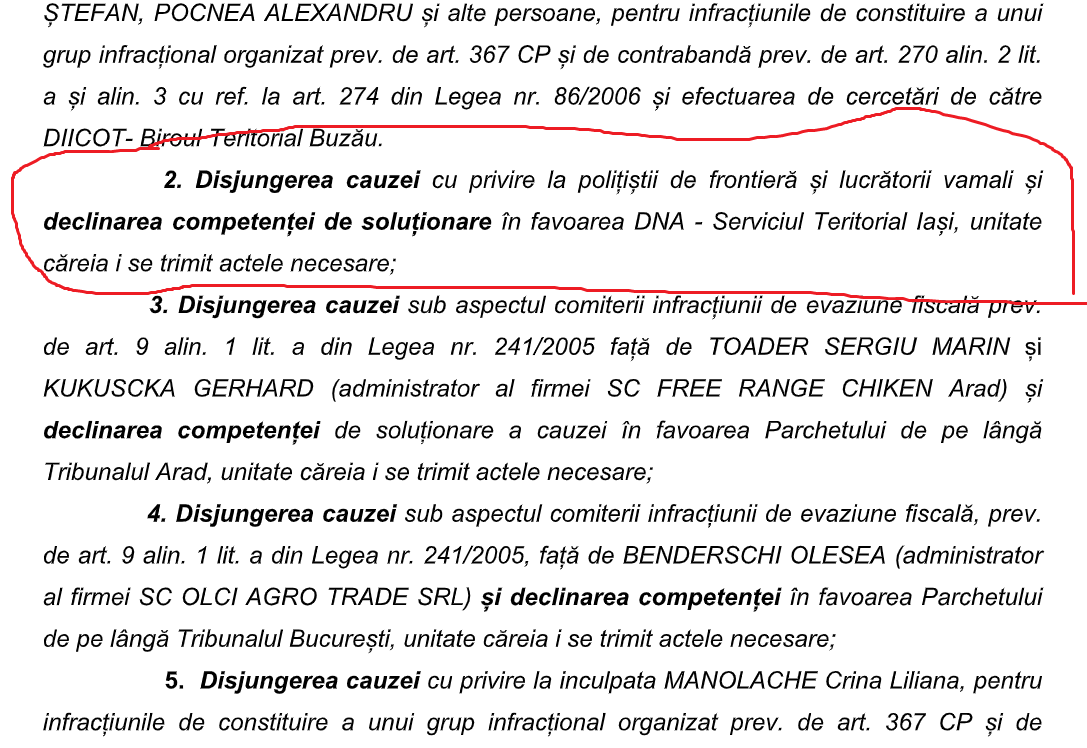 Ancheta a fost efectuata intr-o maniera profesionista, persoanele si vehiculele implicate fiind filate in permanenta de polițiști si lucratori ai serviciilor secrete. Au fost realizate si interceptari telefonice precum si ale discutiilor dintre contrabandisti, vamesi si politisti. Procurorii DIICOT au constatat ca nu au competență sa-i cerceteze pe polițistii si vamesii care au permis ca din Republica Moldova sa intre pe teritoriul Romaniei o cantitate atat de mare de tigari de contrabandă astfel incat, au decis ca o parte din dosar sa fie declinat catre DNA Iasi. ‘’Față de lucrătorii de poliție de frontieră și față de lucrătorii vamali de la vămile Sculeni și Iași, decide declinarea cauzei în favoarea DNA-Serviciul Teritorial Iași, pentru efectuarea de cercetări, potrivit competenței, sub aspectul comiterii unor fapte de corupție în legătură cu cele 11 transporturi investigate’’, se arata intr-o ordonanta emisa de procurorii DIICOT Buzau la sfarsitul lunii octombrie.