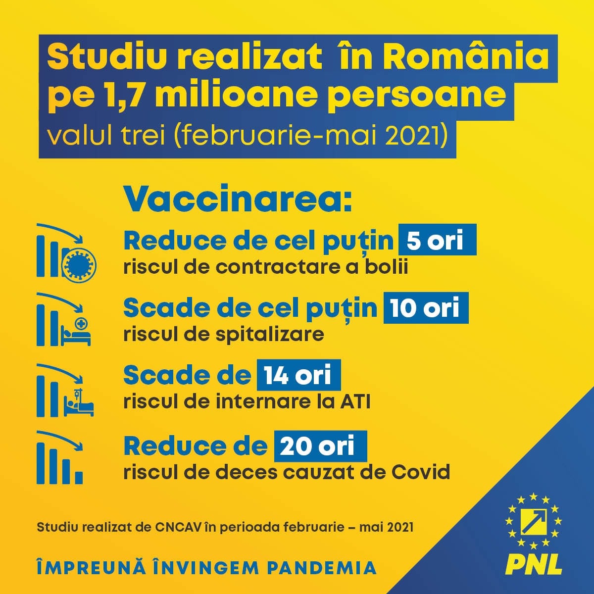 CNCAV a realizat studiul de eficiență a vaccinării împotriva COVID-19 în rândul persoanelor vaccinate, comparativ cu evoluția persoanelor nevaccinate. Setul de date analizat a inclus peste 2,7 milioane de teste (pozitive și negative), colectate de la peste 1,7 milioane de persoane unice, cu vârsta de peste 16 ani și cu istoric cunoscut de vaccinare împotriva COVID-19, și s-a efectuat în perioada februarie – mai 2021, atuncicând varianta Alfa a virusului era dominantă în țara noastră.