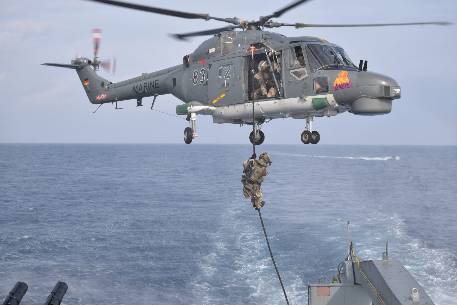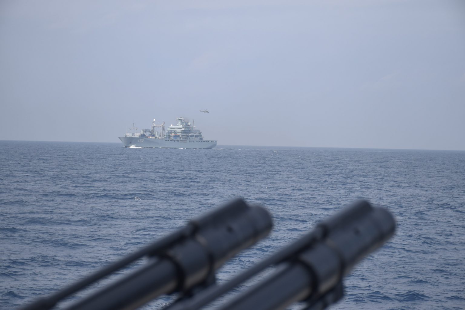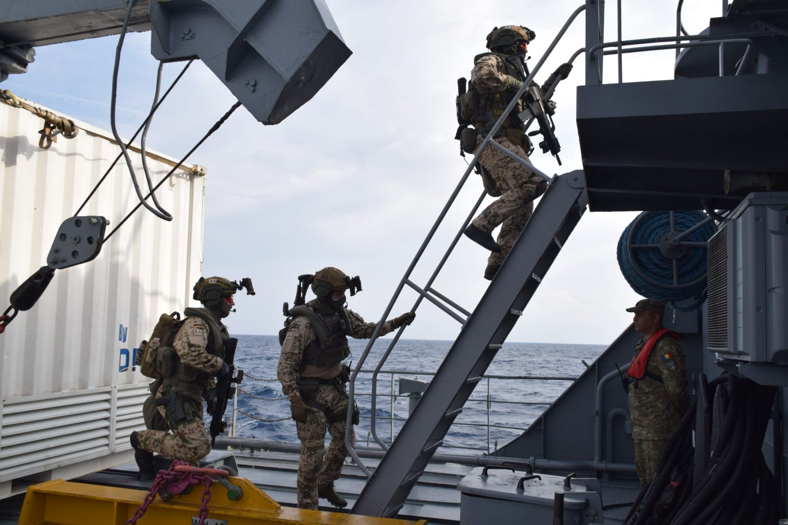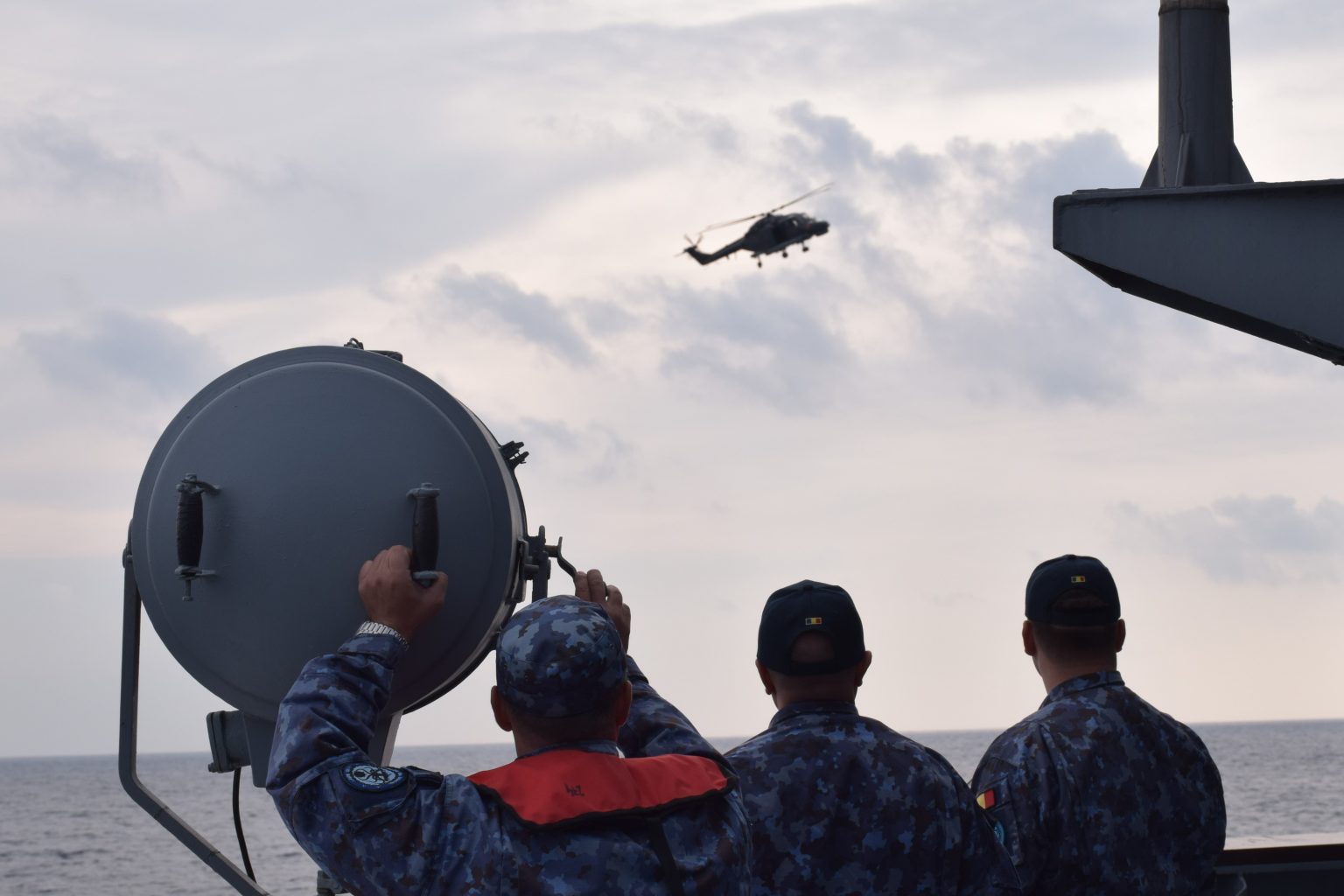 Marți, 9 noiembrie, marinarii militari români au executat o secvență de instruire pe mare, în colaborare cu nava auxiliară germană FGS BONN și elicopterul ambarcat la bordul acesteia.