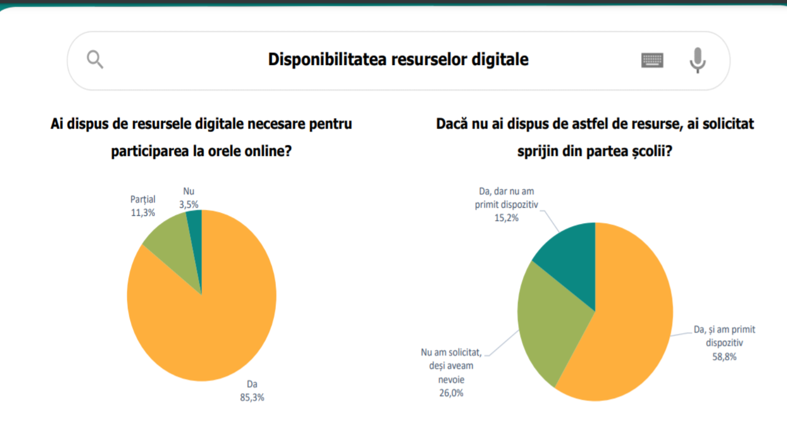 În contextul pandemiei de COVID-19, elevii care nu dispuneau de resursele necesare participării la orele online puteau solicita unității de învățământ un dispozitiv care să le faciliteze participarea la ore. Astfel, 85,3% dintre elevii respondenți au spus că încă de la începutul anului școlar au dispus de resurse digitale, 11,3% au dispus parțial de aceste resurse, iar 3,5% declară că nu au dispus deloc de resurse.
