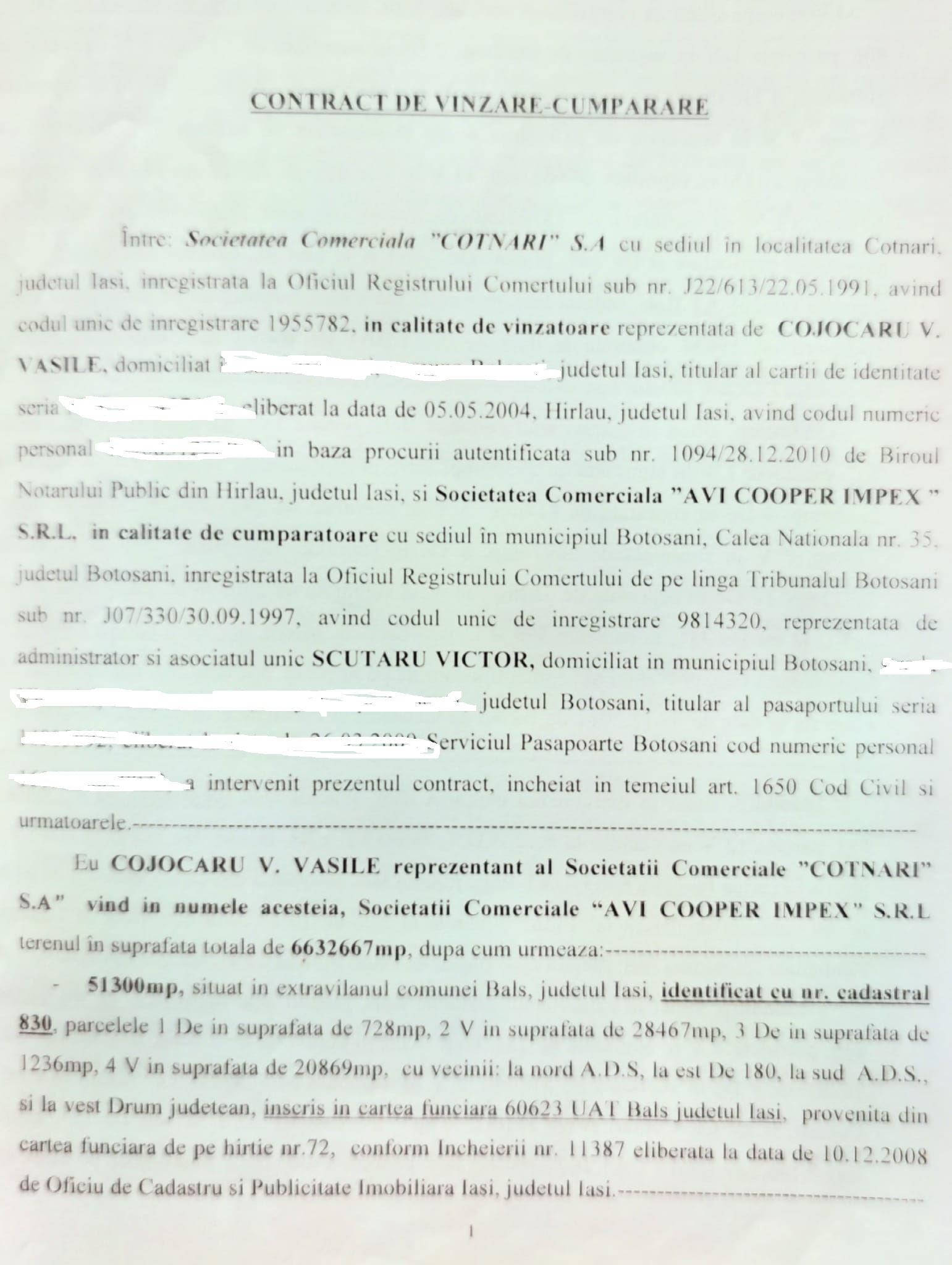 Și, pentru ca acordurile respective nu contin date reale, oamenii au mai aratat ca SC Cotnari SA nu a devenit proprietarul de drept al terenurilor. Mai departe, se mai arata in plangerea penală că, pentru a pierde urma terenurilor revenedicate de tarani, Constantin Deleanu a vandut prin interpusi, o suprafata de 700 hectare de viță de vie catre firma fiilor sai, Casa de Vinuri Cotnari SA. Astfel, in data de 29 noiembrie 2011, SC Cotnari SA, reprezentata de Cojocaru V.Vasile a vandut catre SC Avi Cooper Impex SRL Botoșani reprezentată de Scutaru Victor, suprafața de 700 ha teren la un preț de 2.653.066 lei. După cum se poate vedea deși întreaga suprafață era plantată cu viță de vie, terenul a fost vândut la un preț de nimic adica cu 40 de bani pentru un metru pătrat. În perioada respectivă, la Cotnari și terenurile arabile se vindeau la prețuri de câteva ori mai mari. La scurt timp, pe data de 20 ianuarie 2012, SC Avi Cooper Impex SRL a revândut aceiași suprafata catre firma controlată de cei doi fii ai lui Deleanu, Remus și Victor Deleanu, Casa de Vinuri Cotnari. Pentru cele 700 hectare de viță de vie Casa de Vinuri Cotnari a platit 2.760.000 lei, adică tot circ 40 de bani pentru un metru pătrat. Prezentăm în fotocopii atașate acestui articol, paginile esențiale din cele două contracte de vânzare-cumpărare. Se mai poate observa ca numele Deleanu nu apare in cele doua contracte de vanzare-cumparare. Astfel, SC Cotnari SA si SC Casa de Vinuri Cotnari SA au fost reprezentate la notar de doi angajati necunoscuti. Asta in conditiile in care in perioada in care au fost realizate cele doua tranzactii Constantin Deleanu era director al SC Cotnari SA si presedinte al Consiliului de Administratie al SC Casa de Vinuri Cotnari SA. Cu alte cuvinte, Deleanu stia ca afacerea miroase de la o poștă și a vrut sa scoata cartoful din foc cu mainile altora. Preturile derizorii cu care au fost vandute cele 700 hectare de teren catre firma controlata de fiii lui Constantin Deleanu au stat la baza celorlalte acuzatii de evaziune fiscala si fals formulata in plangerea penale despre care am facut vorbire mai sus.