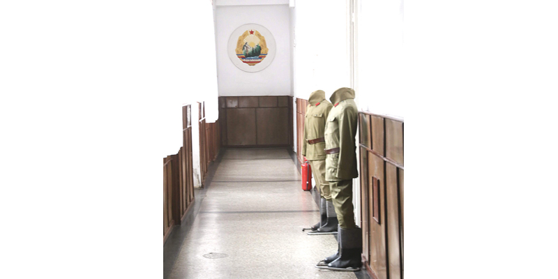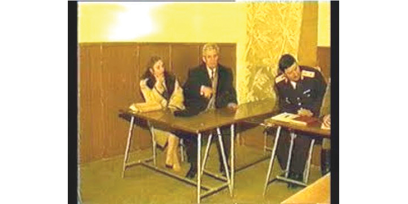 Anul 1989 – Sala unde cuplul Ceauşescu a fost judecat (atunci și acum) şi unde s-a dat sentinţa de condamnare la moarte. Controlul medical fusese făcut în biroul comandantului. Din completul de judecată au făcut parte şi aşa-numiţii asesori populari, care au şi semnat această sentinţă, alături de judecător. În comunism, aceștia erau desemnați din rândul cetățenilor care aveau principii conforme cu linia dictată de sistem.