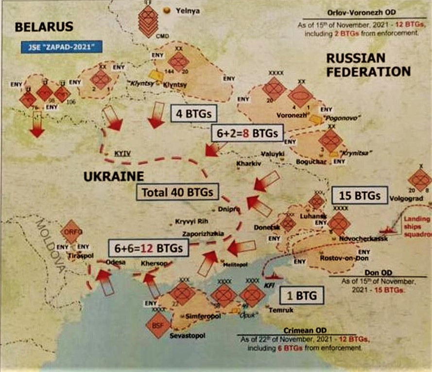 Potrivit informațiilor furnizate de generalul de brigadă Kirilo Budanov, Rusia are dislocate, în prezent, de-a lungul graniței Ucrainei, 40 de grupuri tactice de luptă de nivel batalion, cu aproximativ 94.000 de militari.