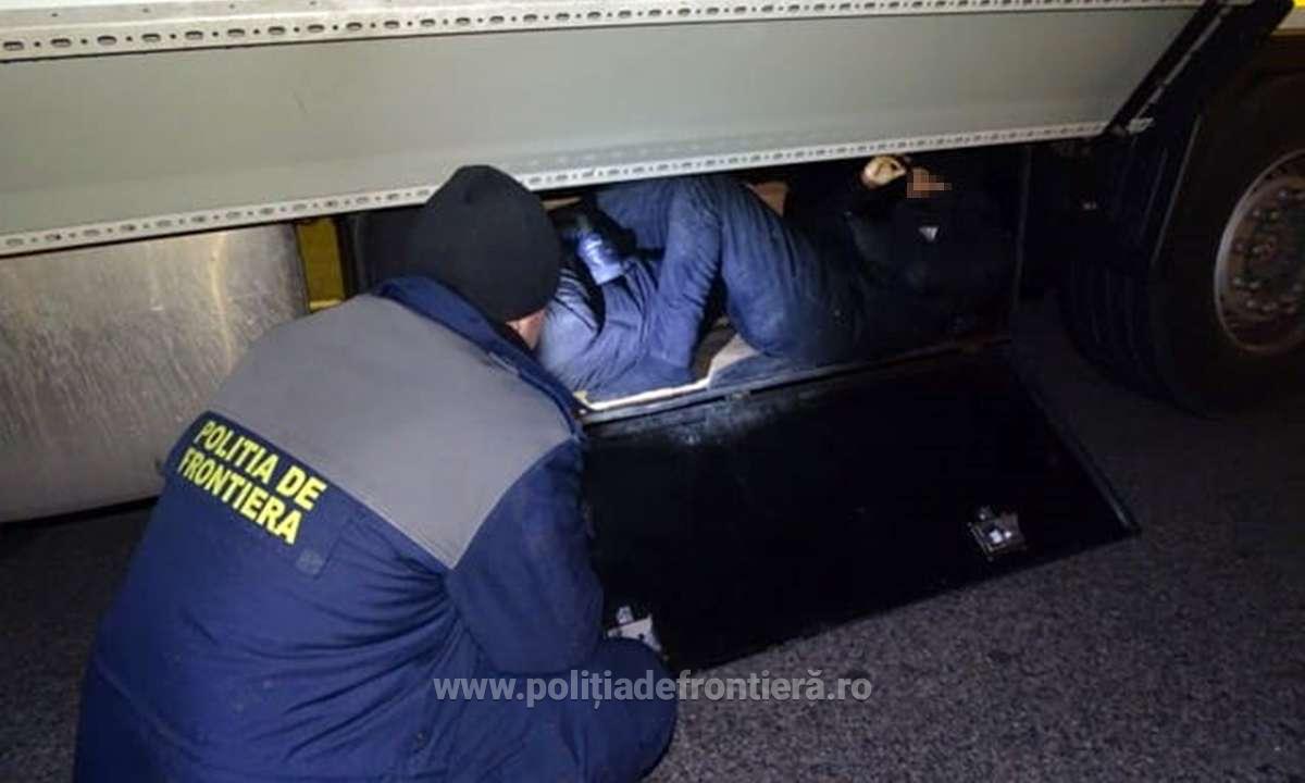 Poliţiştii de frontieră au descoperit doi cetățeni sirieni, ascunși în compartimentul de depozitare bunuri, poziționat pe osia unei semiremorci (VIDEO)