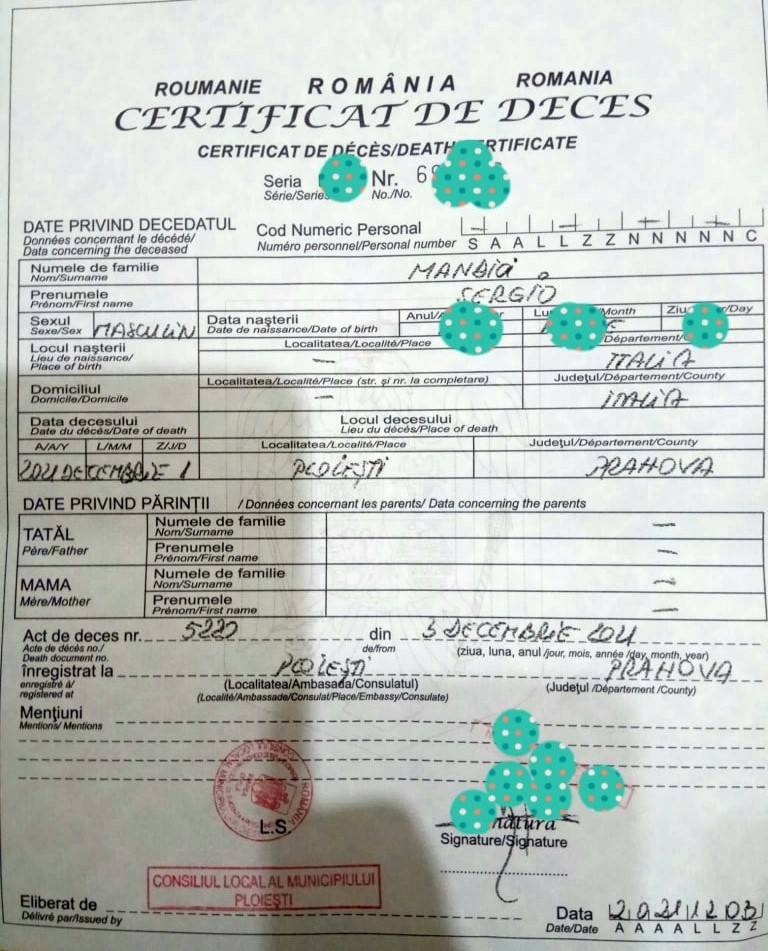 Consoarta cetateanului italian s-a trezit cu un Certificat de Deces complectat la „misto” de cei din institutia aceasta, fara CNP, etc, adica de o hartie cu care poti sa te stergi la partea dorsala, fara a i se elibera un extras multiling completat în baza aceluiași act de stare civilă.