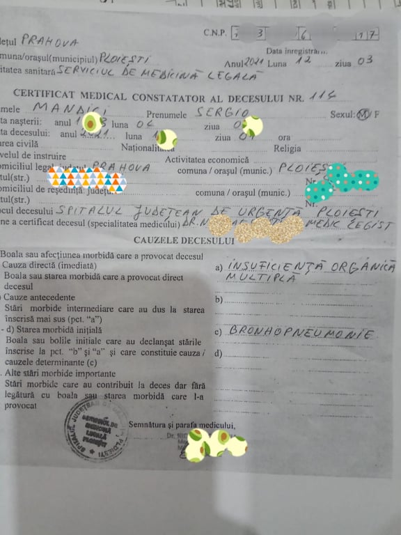 In fapt, a scapat definitiv de cetateanul italian Mandici Sergio, acesta decedand in data de 01.12.2021, orele 07.00, la Sectia de Neurologie unde nu avea ce cauta si lipsit de ingrijirile necesare de la Sectia ATI.