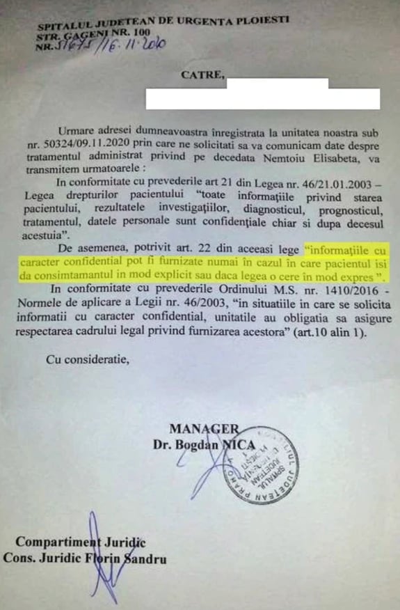 Familia a înțeles exact mesajul clar al managerului Bogdan Nica: vă dăm documentele când se întoarce mortul din mormânt sau când câștigați procesul în instanță împotriva spitalului: „Informațiile cu caracter confidențial pot fi furnizate numai în cazul în care pacientul își dă consimțământul în mod explicit sau dacă legea o cere în mod expres”.