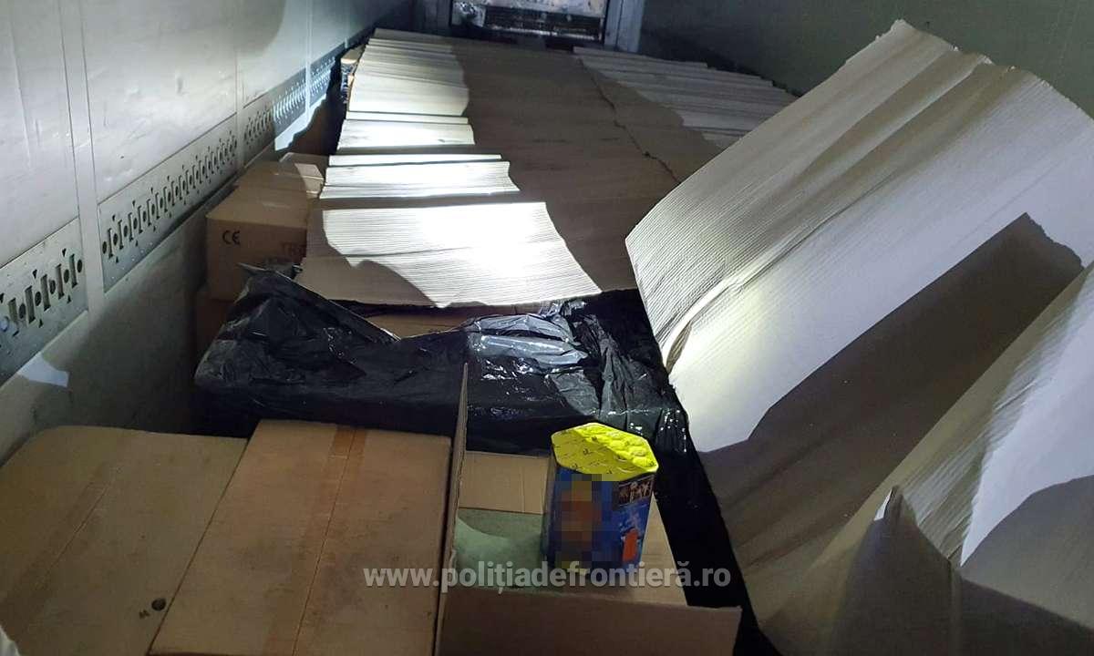 În urma controlului fizic efectuat asupra autocamionului, s-a constatat faptul că, în spatele a șase paleți cu cartofi, erau ascunse, prin metoda capac, sute de cutii care conţineau aproximativ 15.000 de kilograme de articole pirotehnice (petarde, artificii etc).