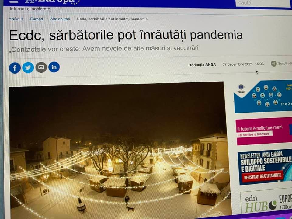 „Suntem într-o situație foarte gravă, cu niveluri ridicate de transmisibilitate Covid. Următoarea perioadă de vacanță, în care contactele între grupuri de oameni cresc, poate înrăutăți lucrurile. Odată cu extinderea ulterioară pe care o așteptăm de la varianta Omicron, situația chiar ar putea trece de la rău în mai rău, de aceea trebuie luate și alte măsuri preventive, în paralel cu o extindere a vaccinării”. Acest lucru a fost declarat de directorul Agenției Europene pentru Prevenirea și Controlul Bolilor (ECDC), Andrea Ammon, într-o sesiune publică a Consiliului UE pentru Sănătate, dezvaluie Sorina Ruxandra Matei. (Cerasela N.).