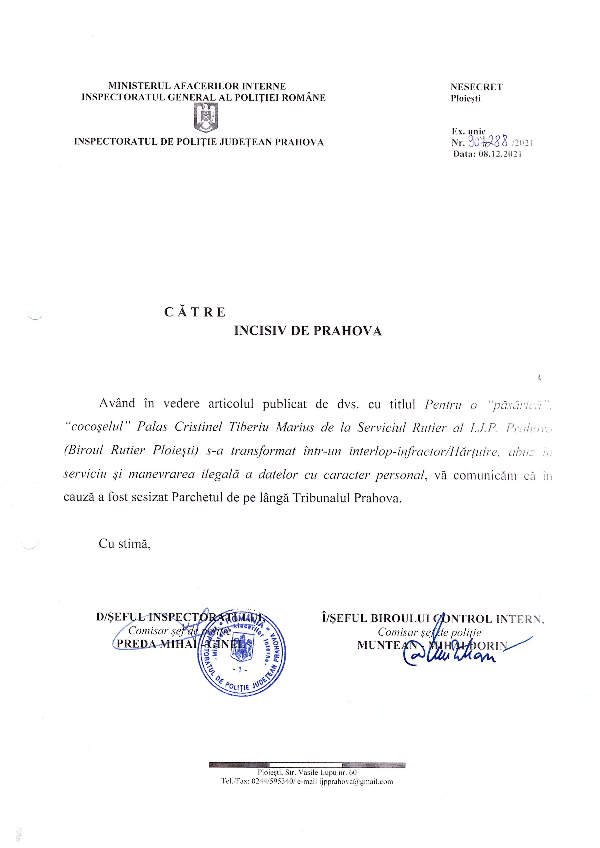 În urma articolului nostru „Pentru o „pasarica”, „cocoselul” Palas Cristinel Tiberius Marius de la Serviciului Rutier al I.J.P.Prahova (Biroul Rutier Ploieşti) s-a transformat intr-un interlop – infractor/Hartuire, abuz in serviciu si manevrarea ilegala a datelor cu caracter personal”, publicat la data de 26.11.2021, și în urma verificărilor interne dispuse operativ și profesional de conducerea IPJ Prahova – a fost sesizat Parchetul de pe lângă Tribunalul Prahova. (Cristina T.)