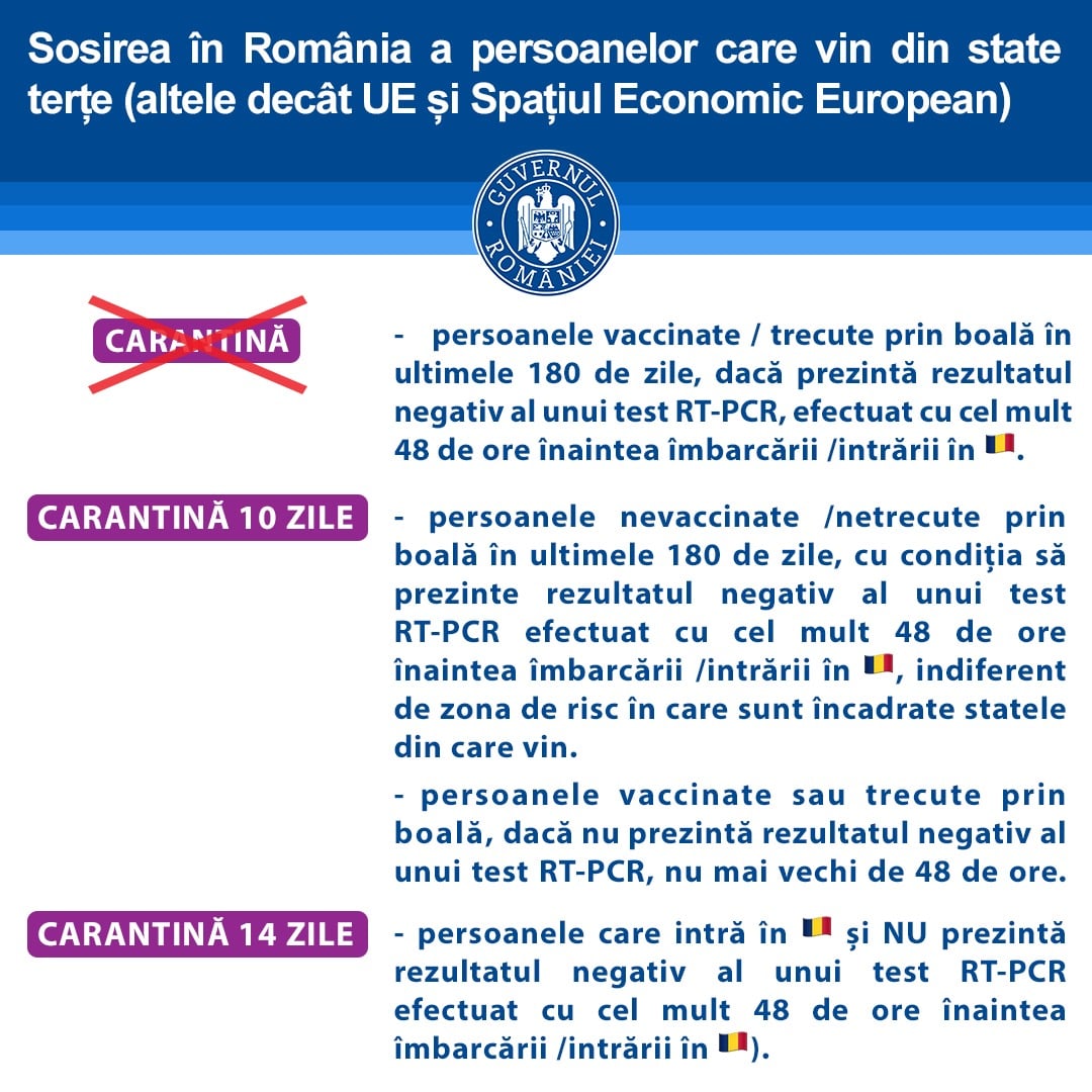 CARANTINĂ DE 14 ZILE dacă nu prezentați un test RT-PCR negativ efectuat cu cel mult 48 de ore înaintea îmbarcării sau intrării pe teritoriul României, sunteți nevaccinați, nu ați trecut prin boală în ultimele 180 de zile.