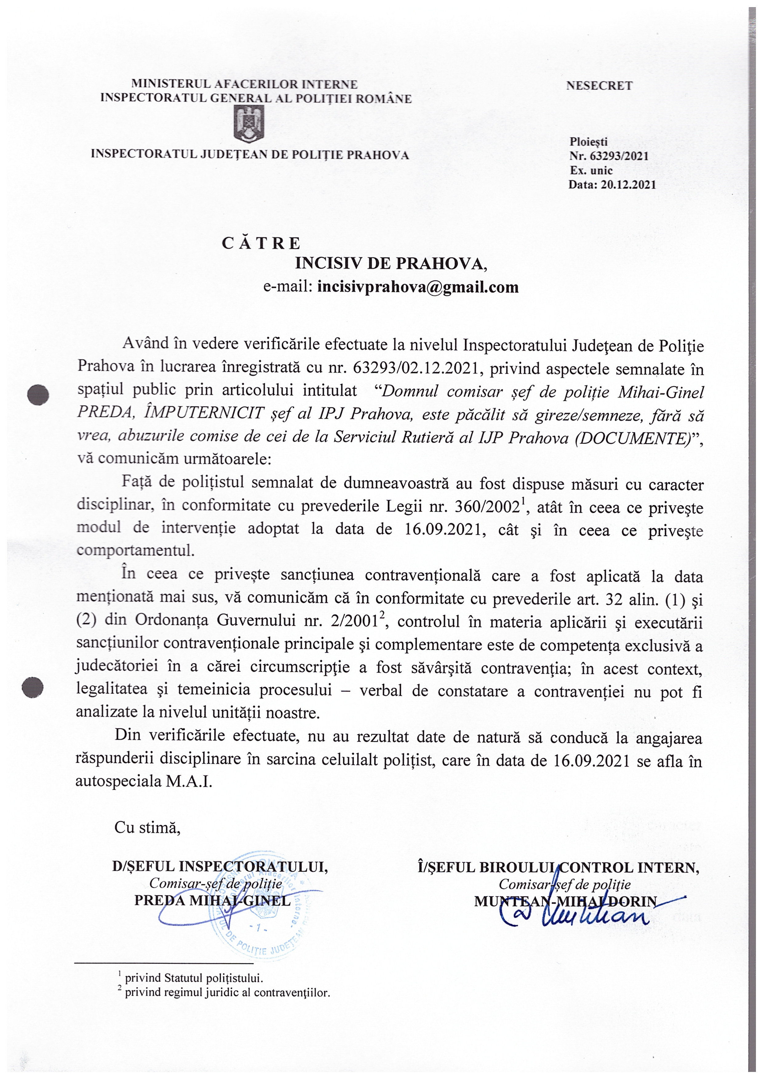 In data de 27.11.2021, Incisiv de Prahova publica articolul: „Domnul comisar șef de poliție Mihai-Ginel PREDA, IMPUTERNICIT șef al IPJ Prahova, este pacalit sa gireaze/semneze, fara sa vrea, abuzurile comise de cei de la Serviciul Rutiera al IPJ Prahova (DOCUMENTE)”.