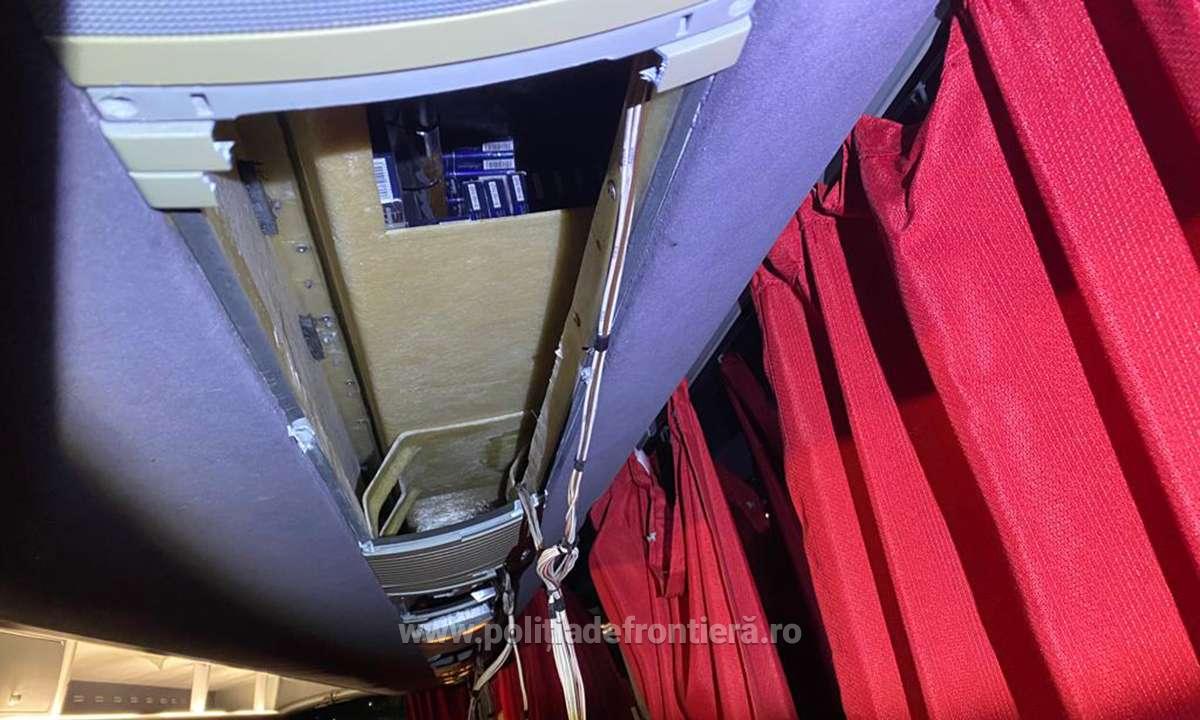 Țigarete, în valoare de 78.800 lei, ascunse în instalația de climatizare a unui autocar (VIDEO)