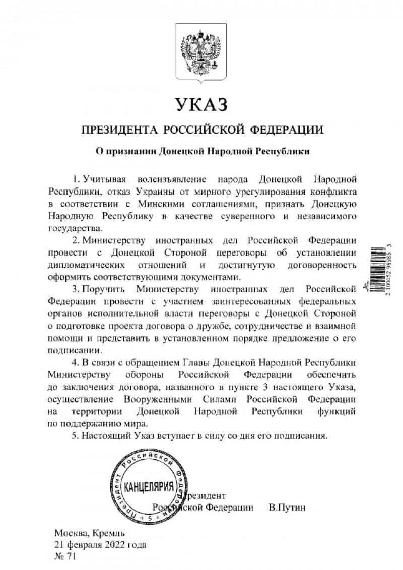 Preşedintele rus Vladimir Putin a semnat decretul prin care recunoaște independenţa regiunilor separatiste Doneţk şi Lugansk, din estul Ucrainei. Acesta urmează să fie ratificat și de Parlament. Putin a cerut Ucrainei „să înceteze războiul” în regiunile separatiste, amenințând cu „consecințe majore”.