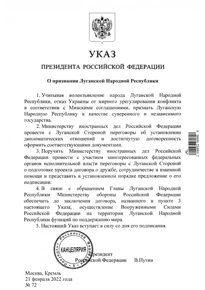 Preşedintele rus Vladimir Putin a semnat decretul prin care recunoaște independenţa regiunilor separatiste Doneţk şi Lugansk, din estul Ucrainei. Acesta urmează să fie ratificat și de Parlament. Putin a cerut Ucrainei „să înceteze războiul” în regiunile separatiste, amenințând cu „consecințe majore”.