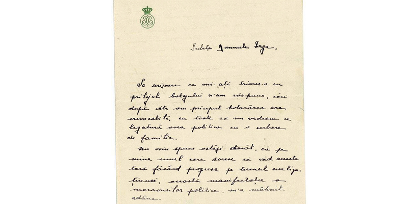 Scrisoare a principelui Carol, prin care iși exprimă mâhnirea legată de lipsa lui Nicolae Iorga de la botezul principelui Mihai (19 ianuarie 1922).