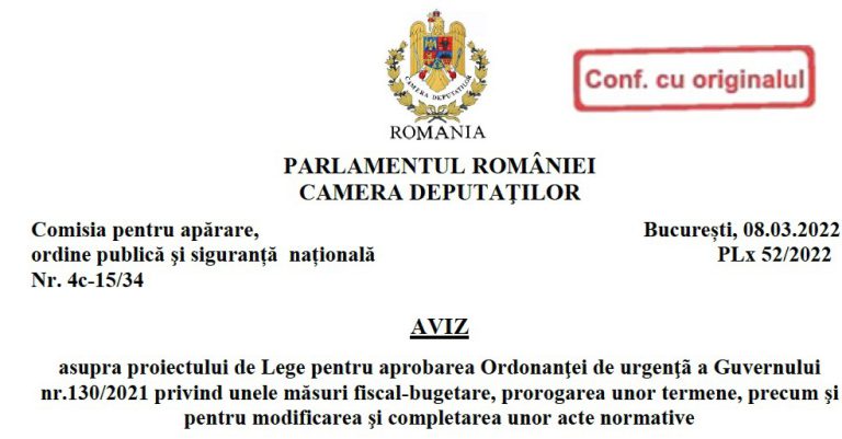 În cursul zilei de ieri, proiectul de Lege privind aprobarea OUG 130/2021 privind unele măsuri fiscal-bugetare, prorogarea unor termene, precum și pentru modificarea și completarea unor acte normative. Singurul amendament pus în discuție și însușit de membri Comisiei pentru apărare, ordine publică și siguranță națională este cel al ministrului MAI, Lucian Bode, ministrului Apărării Naționale, Vasile Dîncu și președintelui Comisiei pentru apărare din Senat, Nicoleta Pauliuc, dezvaluie si sindicatul Europol.