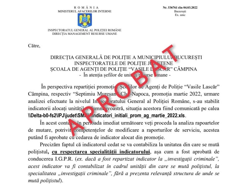 De asemenea, conducerea IGPR a solicitat ca toate mutările efectuate cu schimb de indicator să fie analizate până cel târziu la data de 18.03.2022, urmând a fi implementate în aplicația informatică de mutări creată și gestionată la nivelul DMRU, modificarea raporturilor de serviciu ale polițiștilor în cauza, prin emiterea actelor administrative de mutare, fiind realizată, de regulă, cu data de 01.04.2022, cu excepția situației în care postul ocupat de polițistul care se mută este destinat încadrării promoției, caz în care actul administrativ de mutare se va emite cu data de 23.03.2022, precizeaza sursa citata. (Paul D.).
