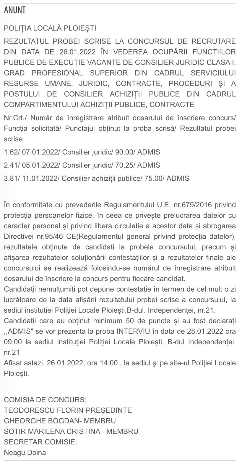 3. La data de 26.01.2022 se afiseaza „rezultatele” la proba scrisa si la data de 28.01.2022, rezultatele la proba „interviu”, concursul fiind finalizat la data de 31.01.2022.