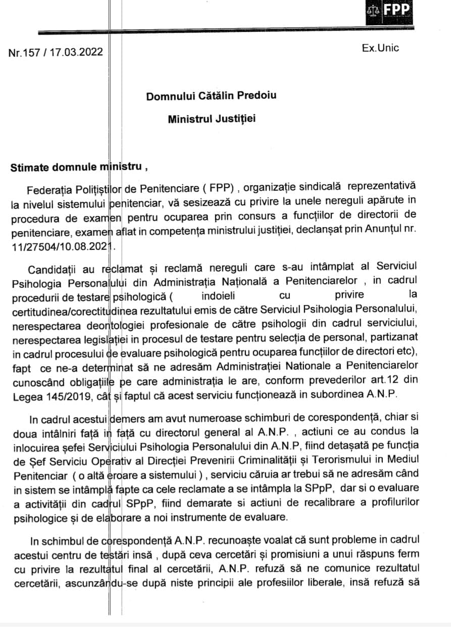 Administrația Națională a Penitenciarelor , în procesul de selecţie a poliţiştilor de penitenciare, ar fi trebuit să garanteaze aplicarea principiilor de egalitate, merit, capacitate profesională şi de transparenţă. conform prevederilor art.12, din Legea 145/2019, Statutul polițiștilor de penitenciare, din păcate nu demonstrează că este dispusă să facă asta, sens in care , așa cum am anunțat, nu ă să lăsam ca acest demers să fie acoperit ca multe altele, precizeaza FPP. (Cerasela N.).