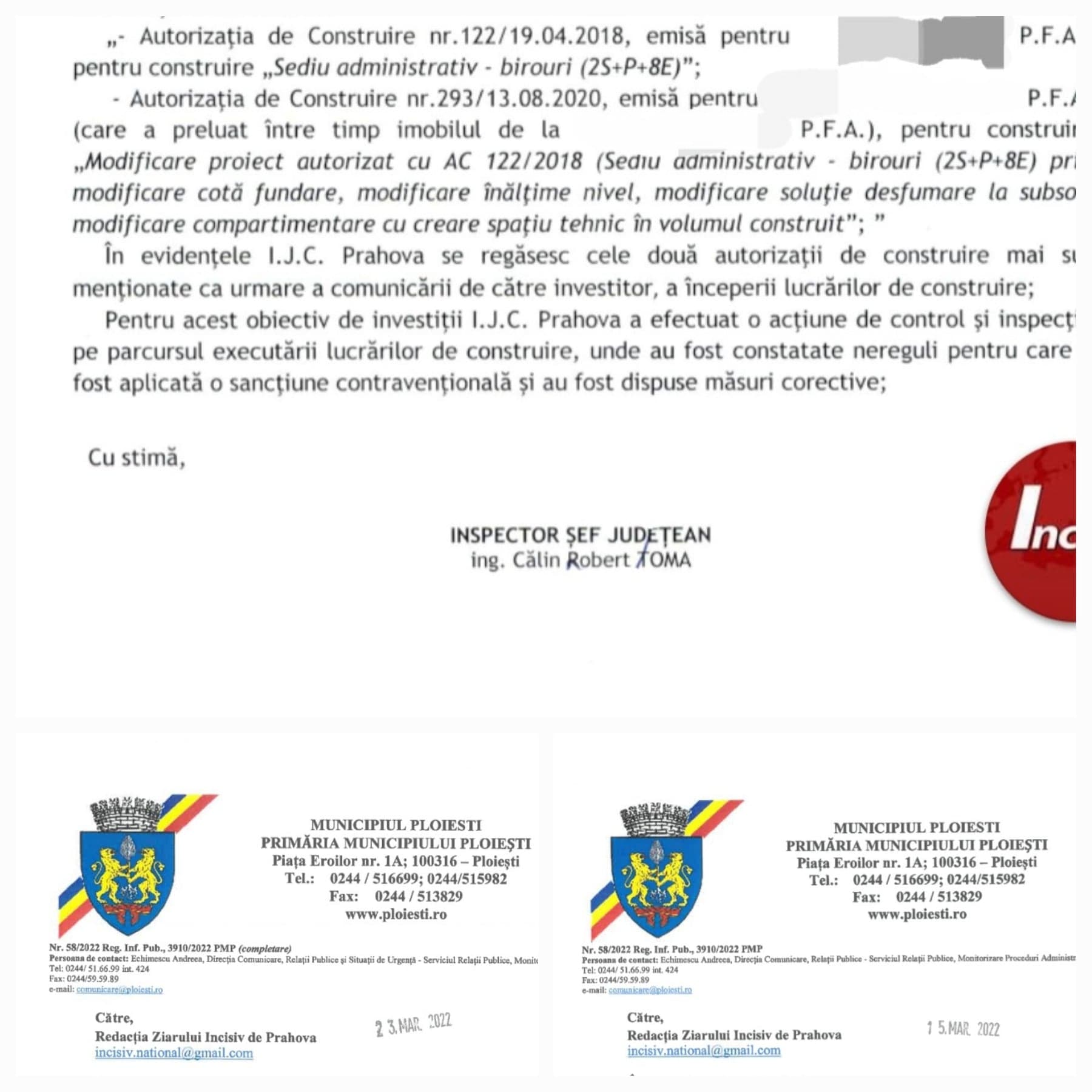 Noi anuntam doar atat! Fals, uz de fals si abuzuri pentru sprijinirea unor afaceri oneroase din domeniul constructiilor, sens in care vom sesiza organele de cercetare penala. Vom reveni cu schema detaliata in amanunt si documentele aferente dupa sedinta Consiliului Local Ploiesti din data de 31.03.2022. (Cristina T.).