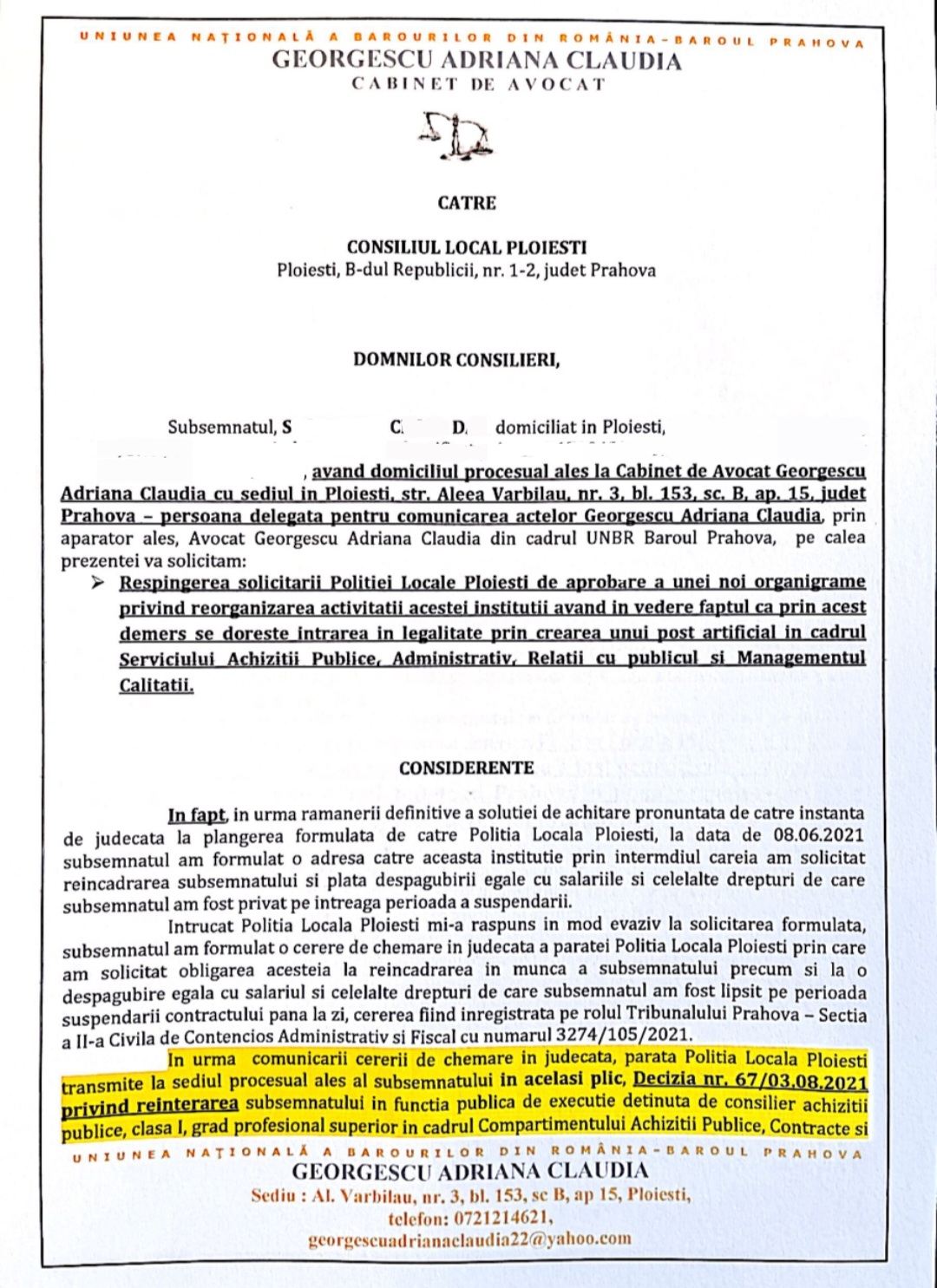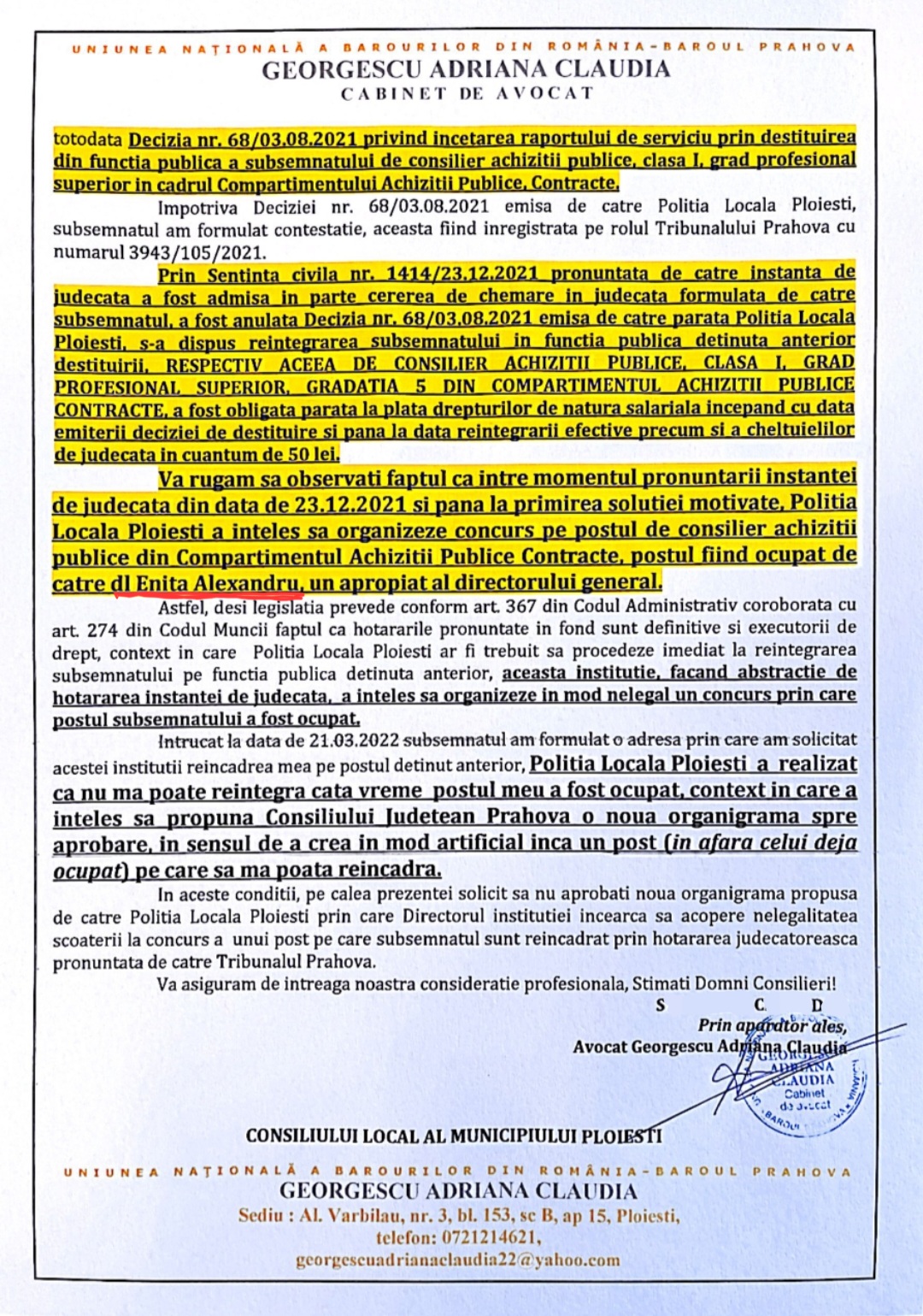Pentru a demonstra ca acest prejudiciu adus bugetului local (aceste sume fiind platite din taxele ploiestenilor), onor’ Albu Catalin (Nasul din LA PIOVRA), in bataie de joc fata de lege si de banii ploiestenilor, emite in acelasi minut din data de 03.08.2021, o noua decizie (nr 68) printr-o interpretare propie a legii si il destituie, ilegal, pe acelasi S.C.D pe care instanta il obligase sa il reaincadreze.