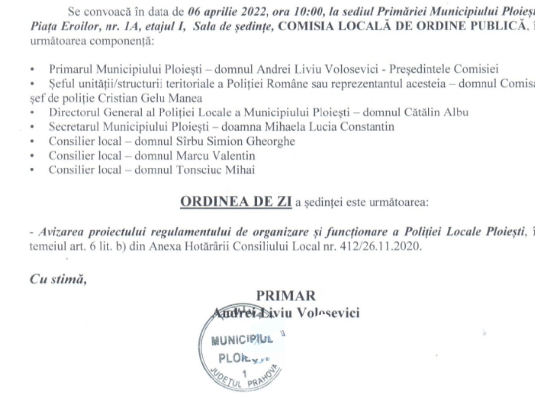 Pe ordinea de zi: avizarea proiectului regulamentului de organizare si functionare a Politiei Locale Ploiesti.