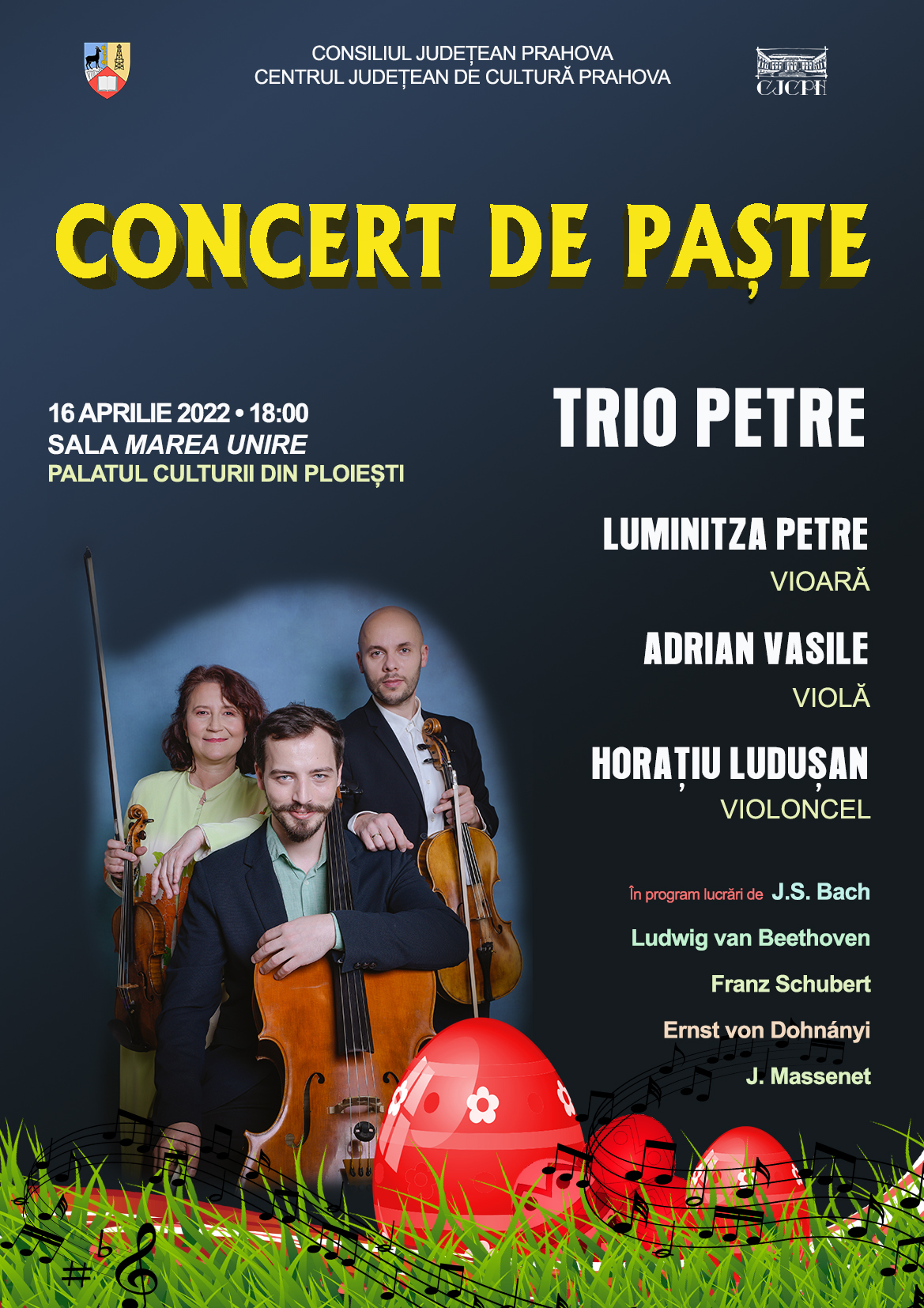 Consiliul Județean Prahova și Centrul Județean de Cultură Prahova prin Serviciul Cercetare. Îndrumare. Valorificare a Patrimoniului Cultural organizează în data de 16 aprilie 2022 ,,Concertul de Paşte” susţinut de grupul Trio Petre