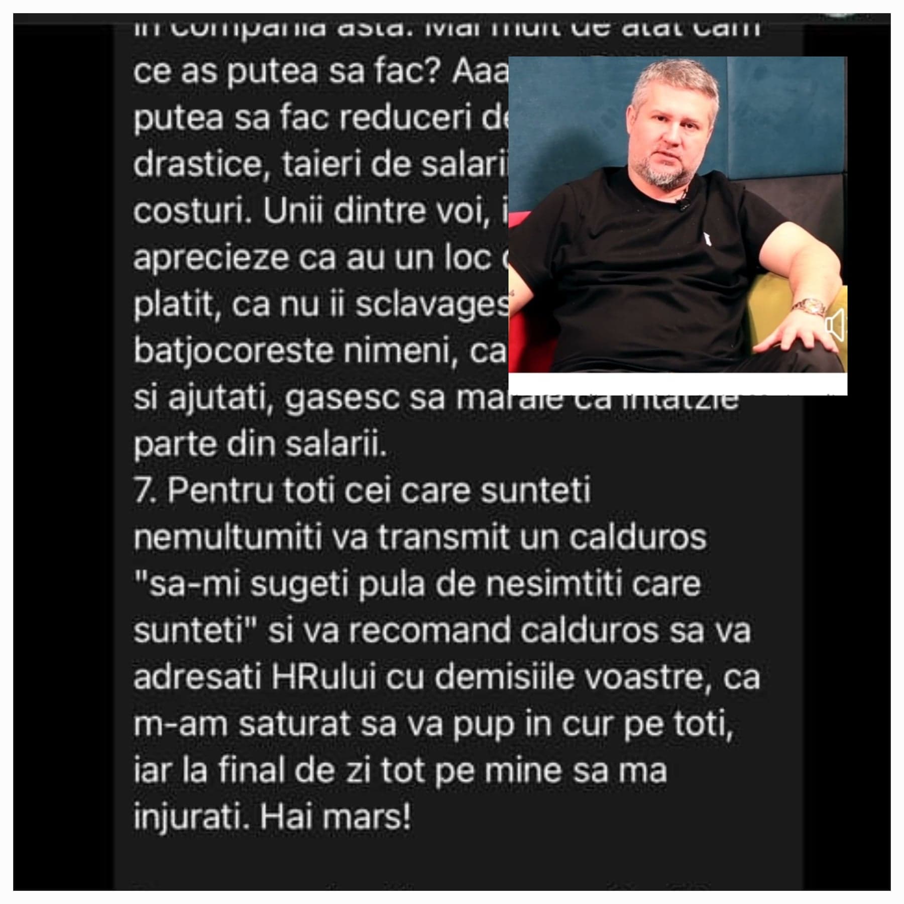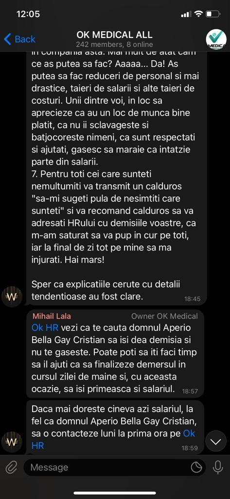 Fara alte comentarii din partea noastra va lasam sa constatati singuri nesimtirea acestui reprezentant cu vocabular de interlop (print screen-uri de pe grupul de WhatsApp al angajatilor).