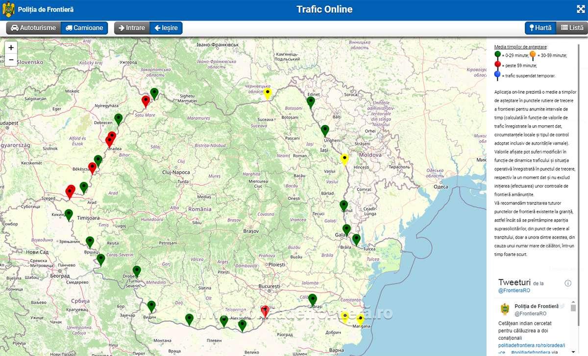 Reamintim că Poliţia de Frontieră Română a dezvoltat aplicaţia on-line și pentru autovehiculele de mare tonaj care este disponibilă pe pagina de internet www.politiadefrontiera.ro, care prezintă o medie a timpilor de aşteptare în punctele rutiere de trecere a frontierei pentru anumite intervale de timp.