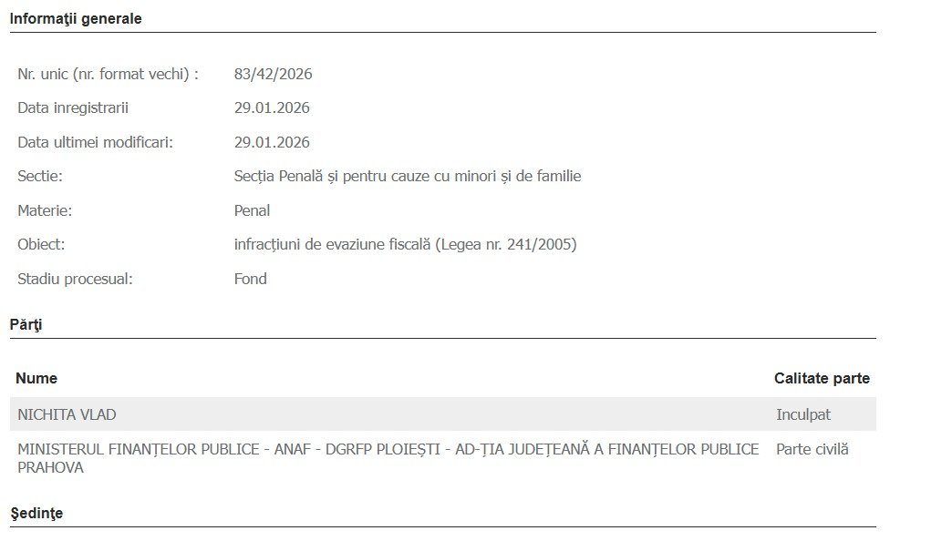Ați crezut că doar „fraierii” de cumpărători de apartamente sunt buni de „muls”? Ei bine, un document nou-nouț, înregistrat la Tribunalul Prahova chiar pe 29.01.2026, demonstrează că și statul român, prin Ministerul Finanțelor Publice – ANAF Prahova, are pretenții! Cu numărul unic 83/42/2026, dosarul proaspăt deschis îl are pe nimeni altul decât pe Vlad Nichita, celebrul „Il Capo” al escrocheriilor imobiliare din Ploiești (așa cum l-au supranumit investigațiile Incisiv de Prahova), în calitate de… inculpat.