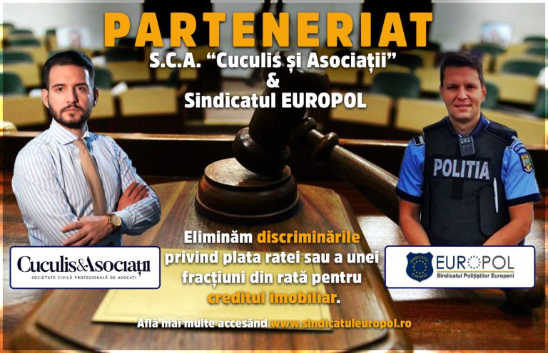 Vă informăm despre recenta colaborare începută cu S.C.A. „Cuculis și Asociații”, ce vizează reprezentarea membrilor Sindicatului EUROPOL pentru revendicarea dreptului de a beneficia de plata unei fracțiuni din rata în cazul polițiștilor care și-au achiziționat o locuință înainte de 6 decembrie 2018, data publicării în M. Of. a Legii 288/2018 prin care a fost modificată Legea 360/2002 privind Statutul polițistului, comunica sindicatul Europol.