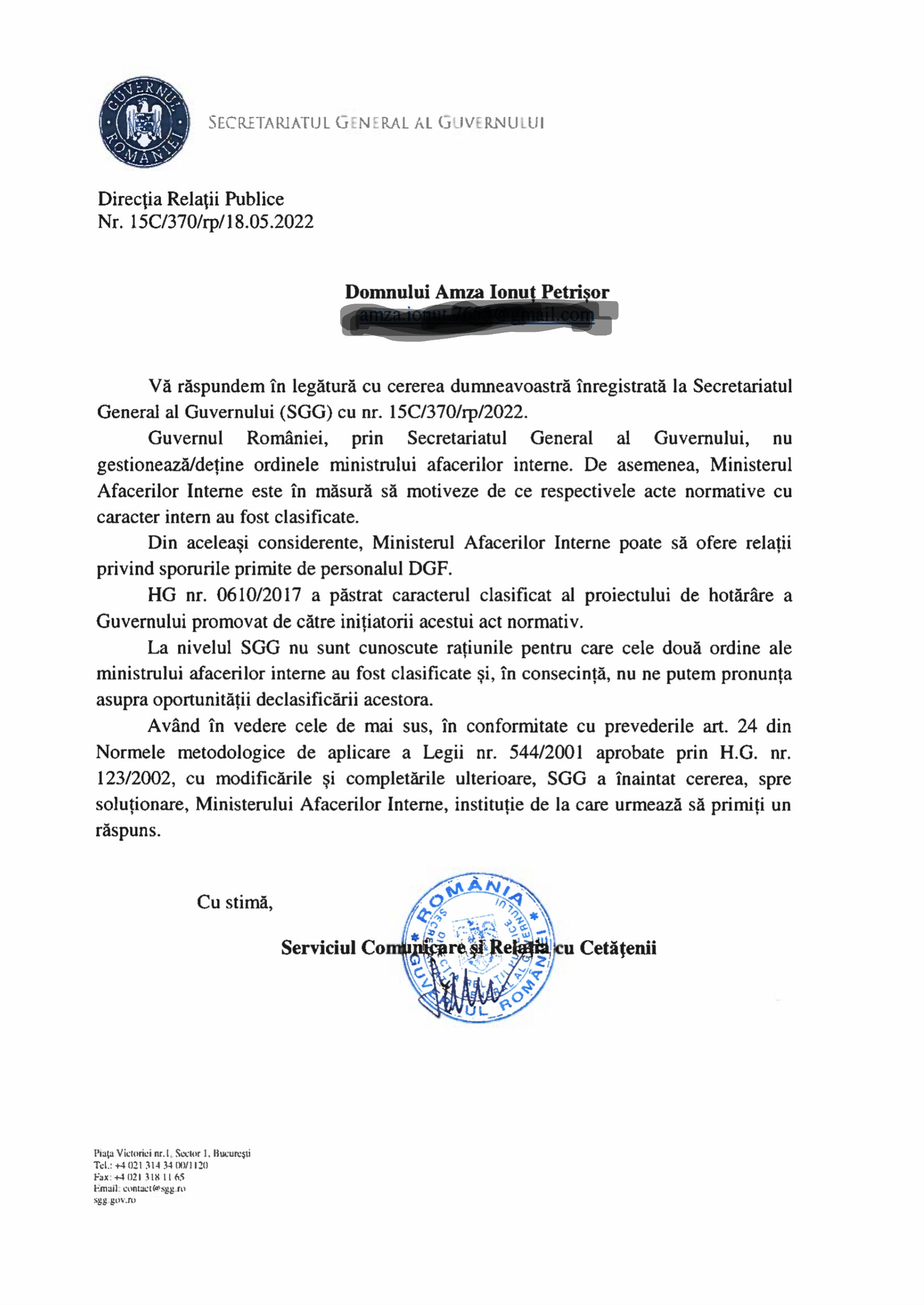 Iar HG 0160/2017 a fost secretizata de Guvern, sa mori de ras, la solicitarea initiatorilor ! Adica MAI, MAN, SRI.