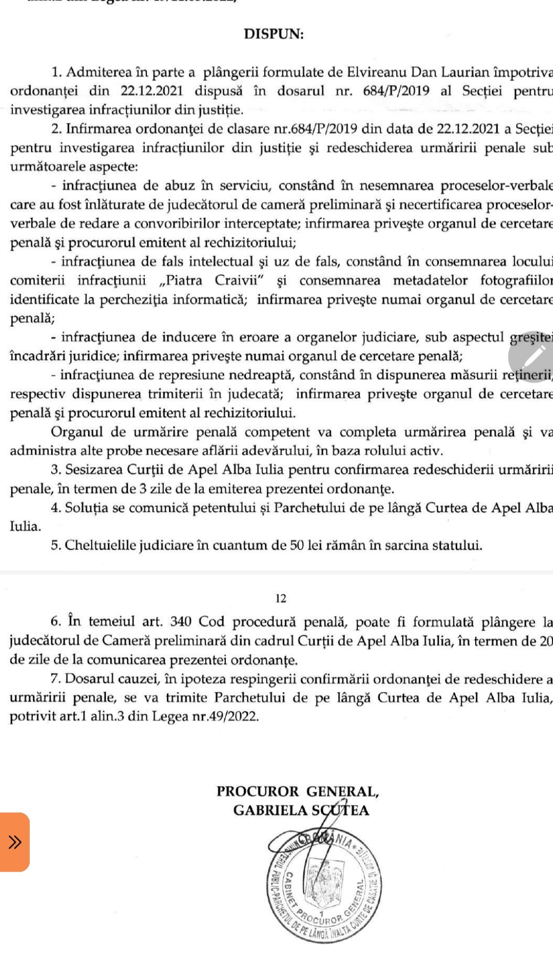 Iata ca, la doua luni de la dezvaluirile noastre, la data de 06.04.2022, Procurorul general al Romaniei, Gabriela Scutea, a redeschis urmarirea penală în dosarul 684/P/2019 clasat de către fostul SIIJ