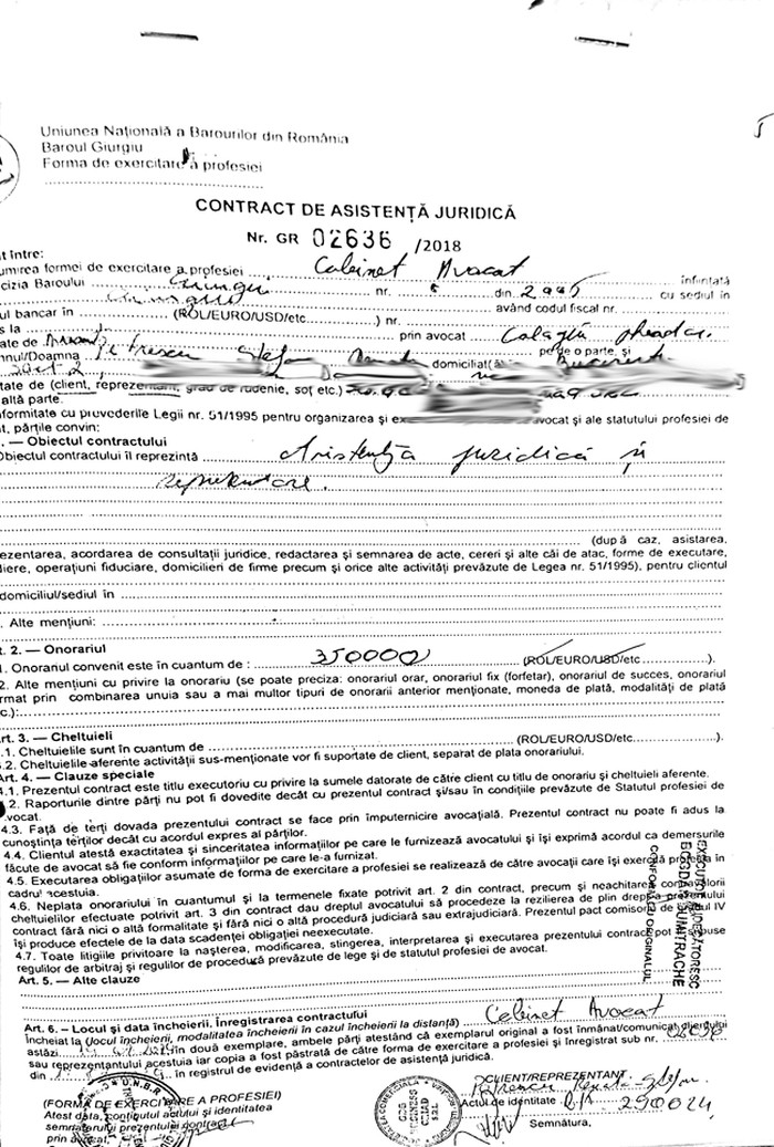 ”contractele fictive nr.(…) tipizatele sunt din 2018 și contractele au date pentru anul 2022 (…) implicați avocatul (…), notarul (…), executorul judecătoresc (…), care au solicitat încuviințarea executării fără a verifica dacă exista creanța și dacă este certă, lichidă și eligibilă (…) contractul de asistență juridică de 1.300.000 euro – sunt de fapt 3 contracte de asistență juridică încheiate. ATENȚIE! – nu cu societatea care este executată, ci cu administratorul acesteia persoană fizică. De altfel, persoana fizică este parte în dosare, nu persoana juridică. Interesant este faptul că aceste contracte nu sunt depuse în original la dosarul de executare, existând suspiciuni rezonabile că ele au fost modificate/contrafăcute ulterior prin adăugarea societății la o altă rubrică a contractului și nicidecum la rubrica „parte” , pentru a justifica astfel care ar fi motivul pentru care se solicită executarea. Mai mult, inițial aceste contracte au fost prevăzute cu un onorariu iar ulterior acest onorariu a fost mărit prin acte adiționale (fiecare contract are câte 3 acte adiționale), până ce s-a ajuns la suma totală de 1.300.000 euro. Contractele de asistență juridică nu au obiect, mai bine spus această rubrică nu cuprinde activitatea pe care avocatul trebuie să o presteze pentru client și nu cuprinde instanțele de judecată, Parchetele, instituțiile unde se desfășoară activitatea juridică în cuantum total de 1.300.000 euro.